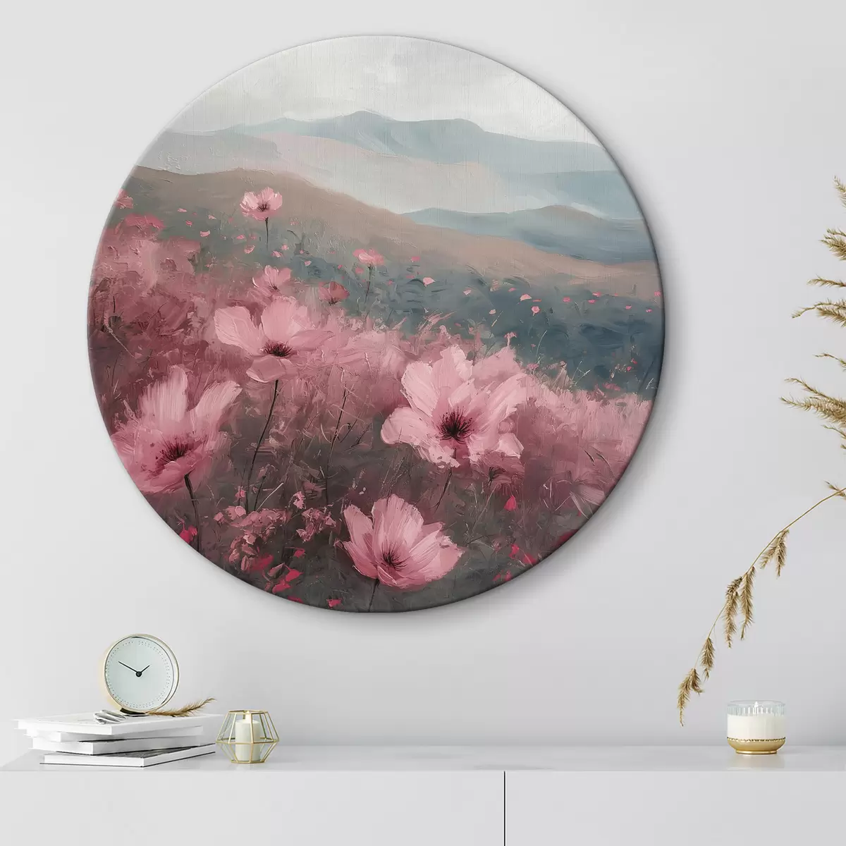 Okrągłe obrazy Różowe kwiaty na łące, krajobraz natury, góry, malarstwo olejne, żywe pociągnięcia pędzla r40233