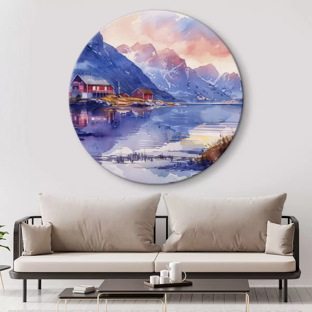 Okrągłe obrazy Norweska wioska, niebo o zachodzie słońca, spokojna rzeka, góry, akwarela r40311