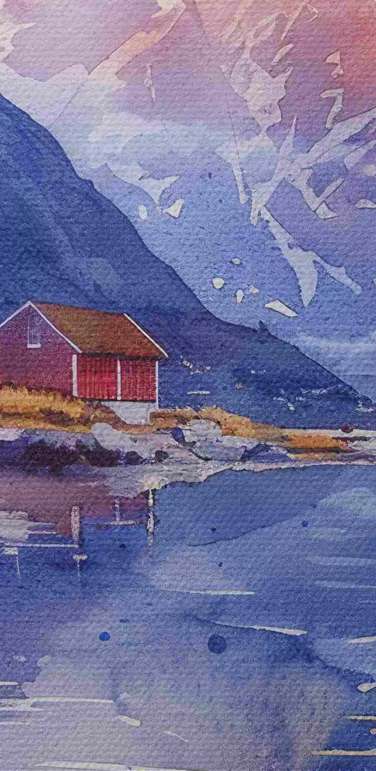 Okrągły obraz Norweska wioska, niebo o zachodzie słońca, spokojna rzeka, góry, akwarela Nr r40311