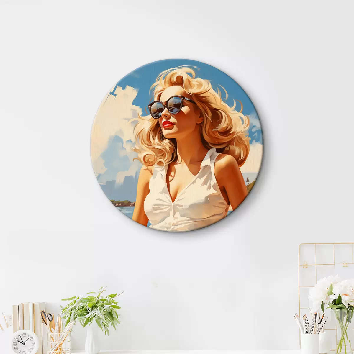 Okrągły obraz Blondynka na tle morza ilustracja Nr r40321