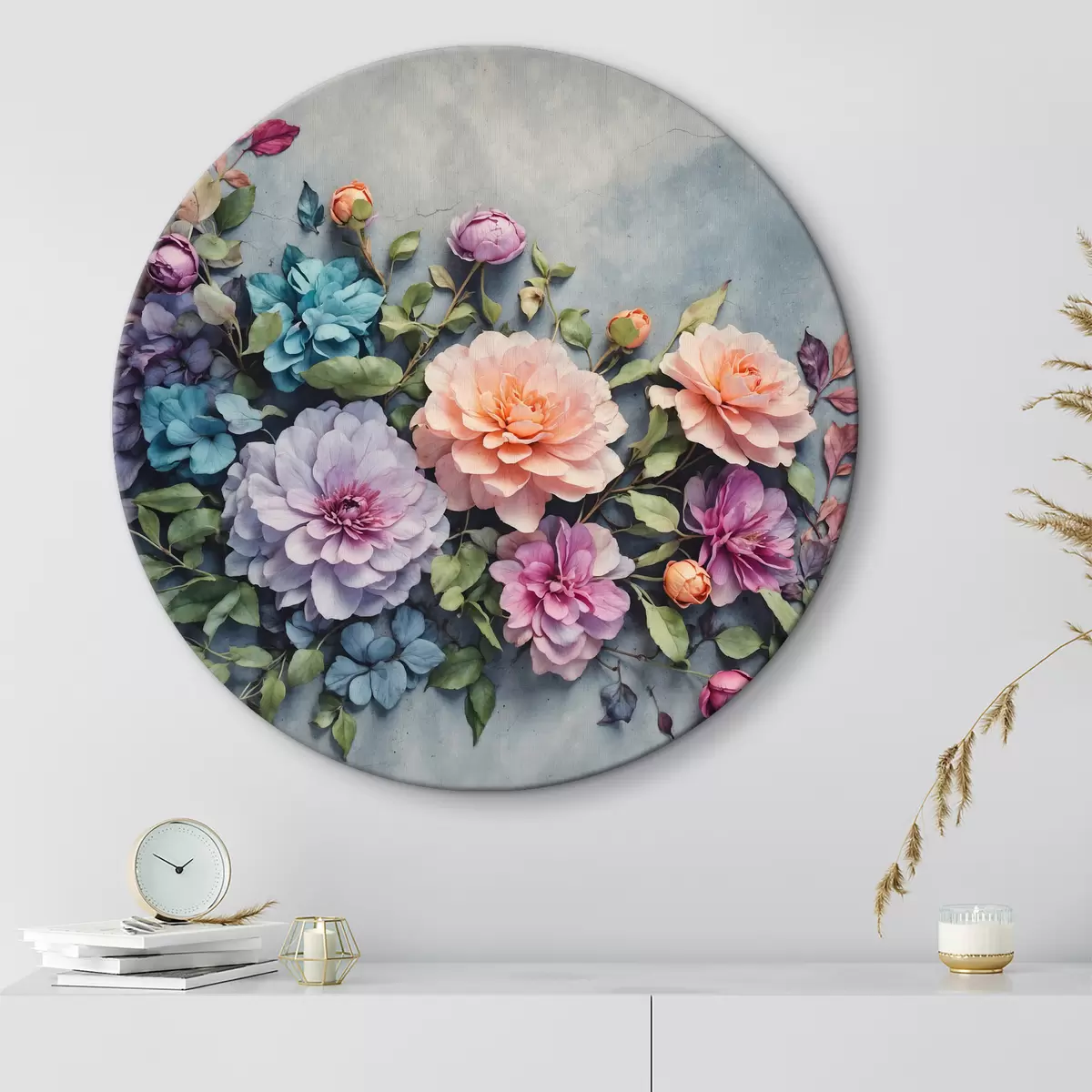 Okrągły obraz Kwiaty i liście na niebieskim tle Nr r40346