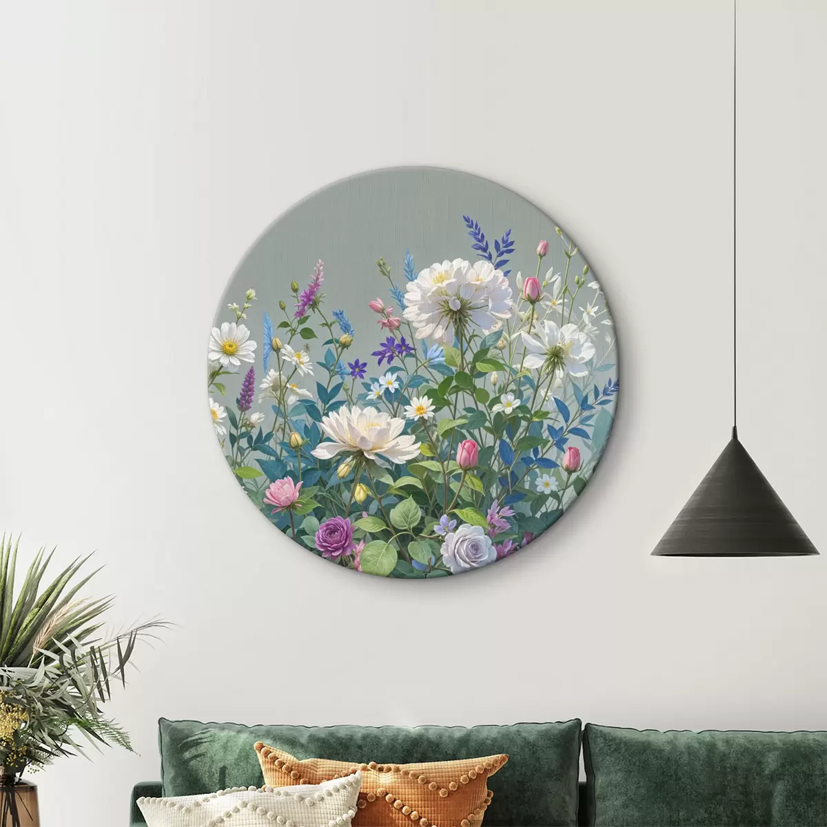 Okrągły obraz Bujny, żywy ogród pełen różnorodnych kolorowych kwiatów i kwitnących roślin na szarym tle Nr r40393