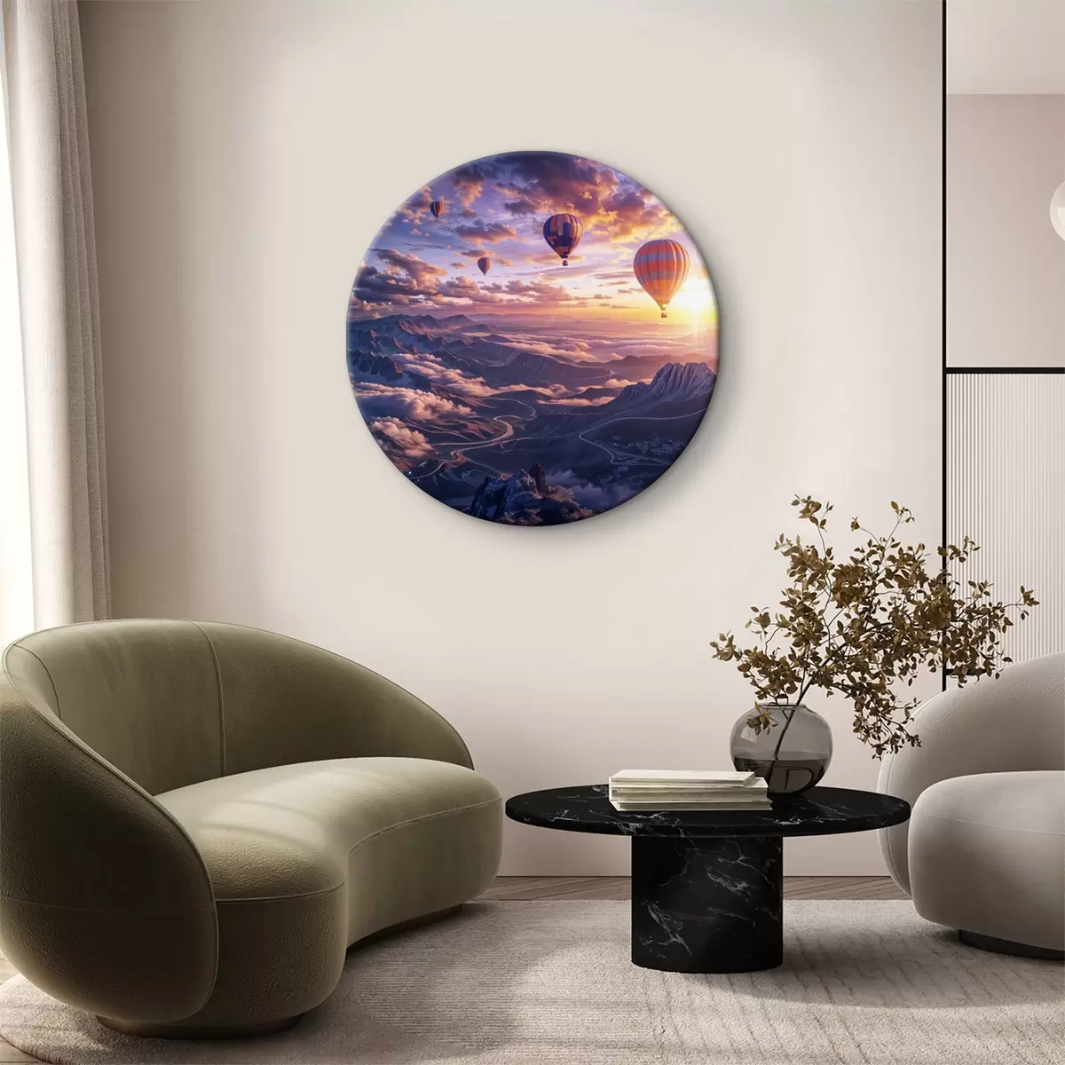 Okrągły obraz Balony na ogrzane powietrze unoszące się nad górzystym krajobrazem o zachodzie słońca, z chmurami i żywymi kolorami na niebie Nr r40397