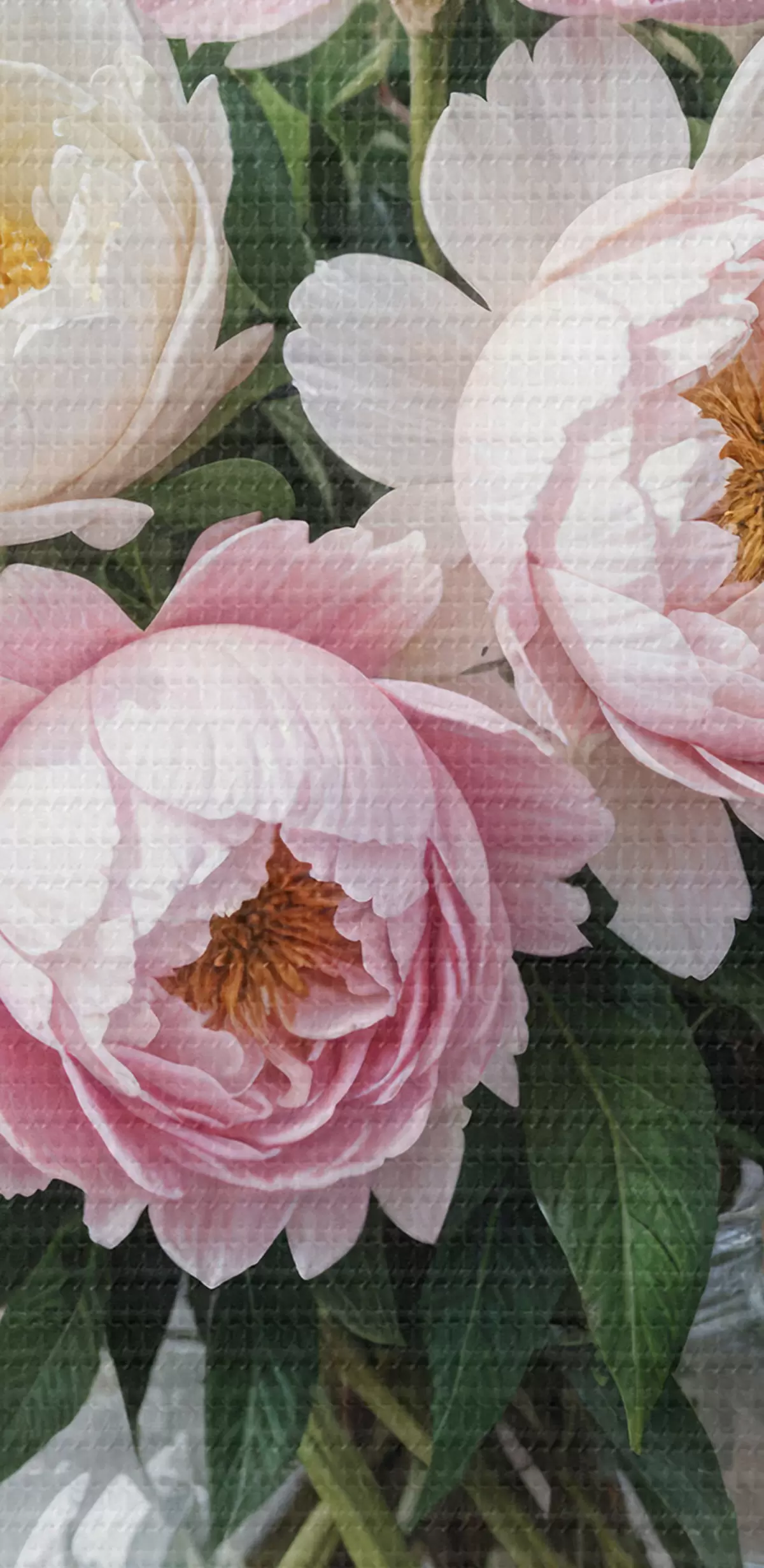 Okrągły obraz Bukiet pięknych różowych i białych piwonii w szklanym wazonie, ułożony na drewnianej powierzchni Nr r40398