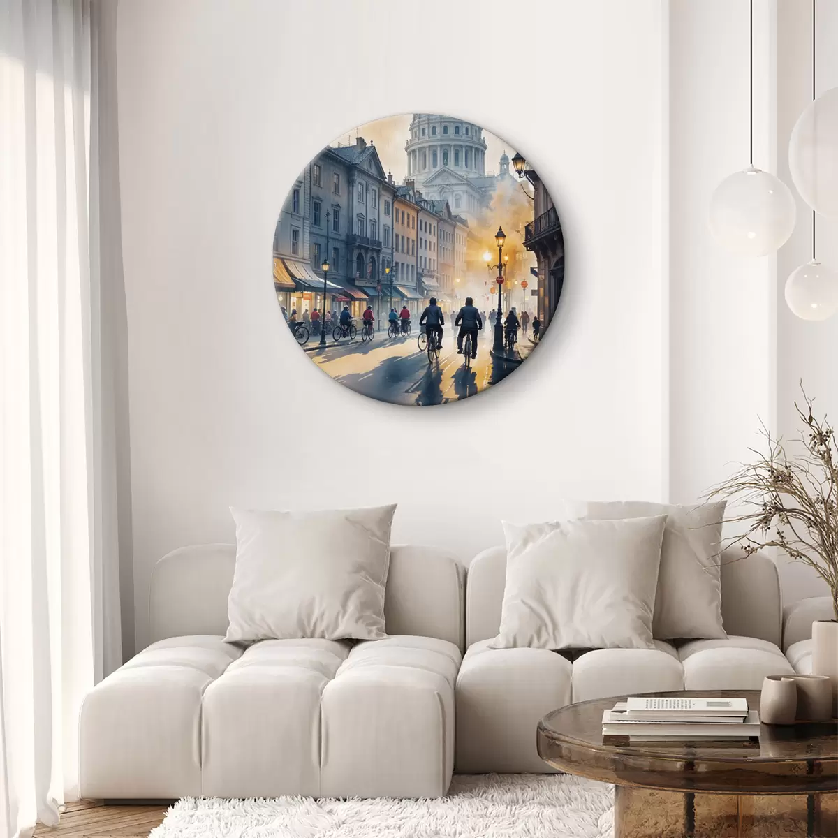 Okrągły obraz Zatłoczona uliczna scena akwarelowa w europejskim mieście, z ludźmi spacerującymi i jeżdżącymi na rowerach wzdłuż ulicy Nr r40410