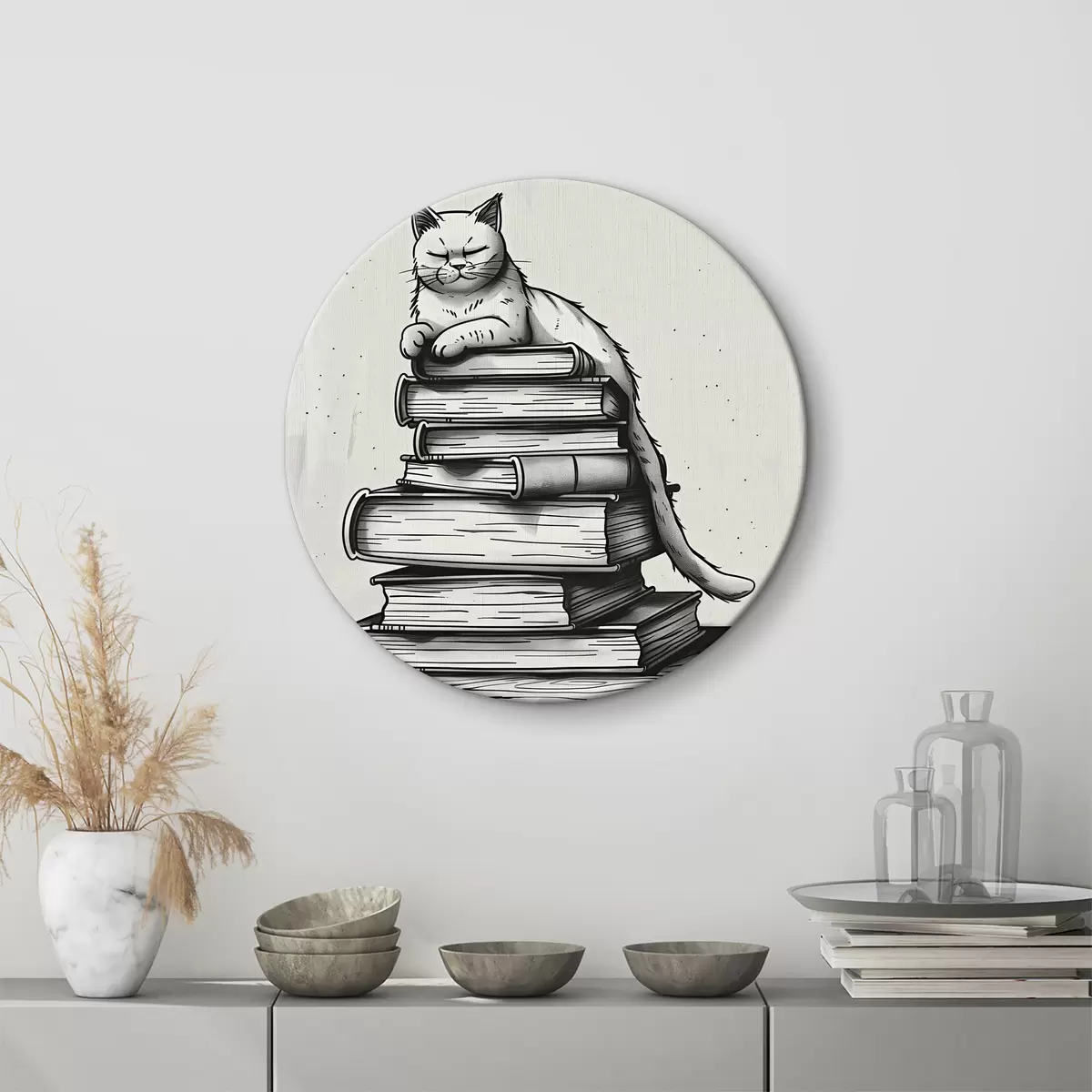 Okrągły obraz Czarno-biały kot na stosie książek Nr r40435
