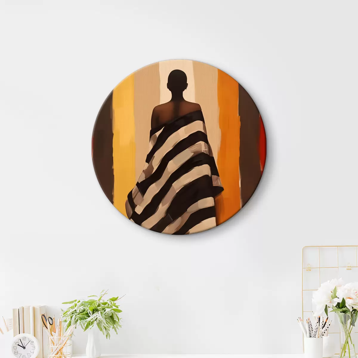 Okrągłe obrazy Sylwetka Afroamerykanki w pasiastym płaszczu na tle pionowych pasów w kolorze czarnym, beżowym, żółtym, czerwonym i brązowym r40487