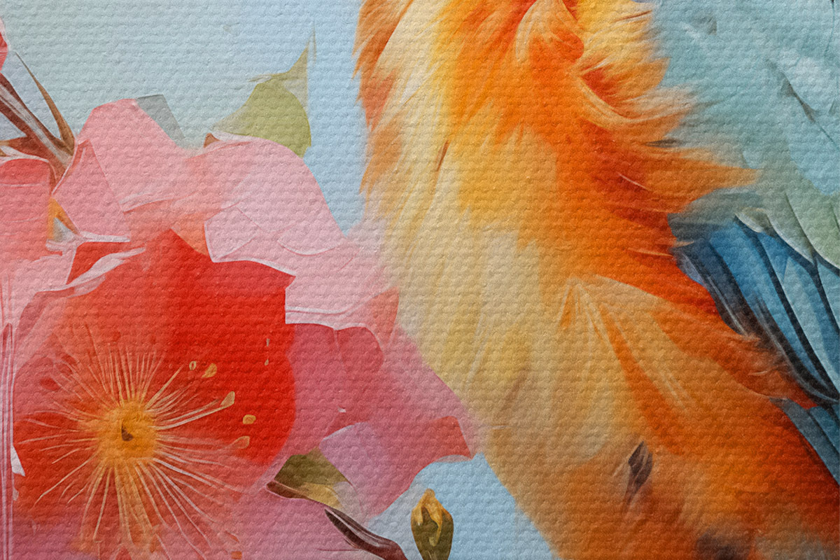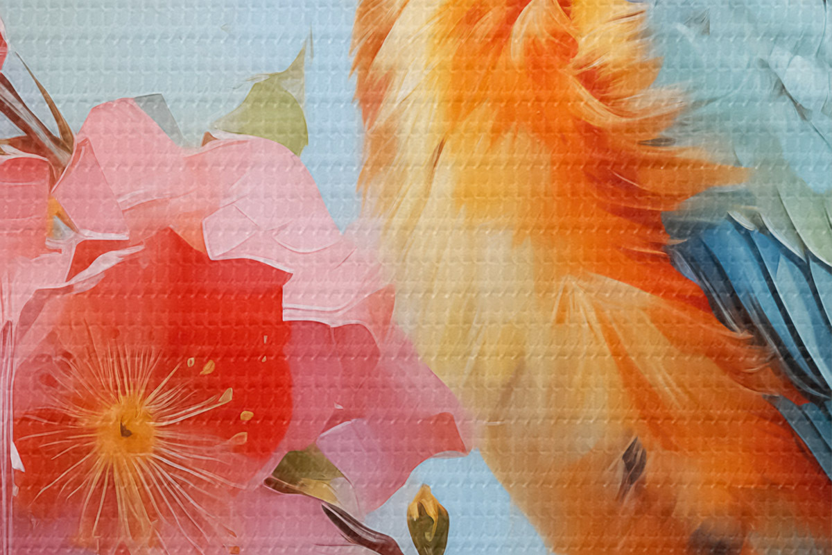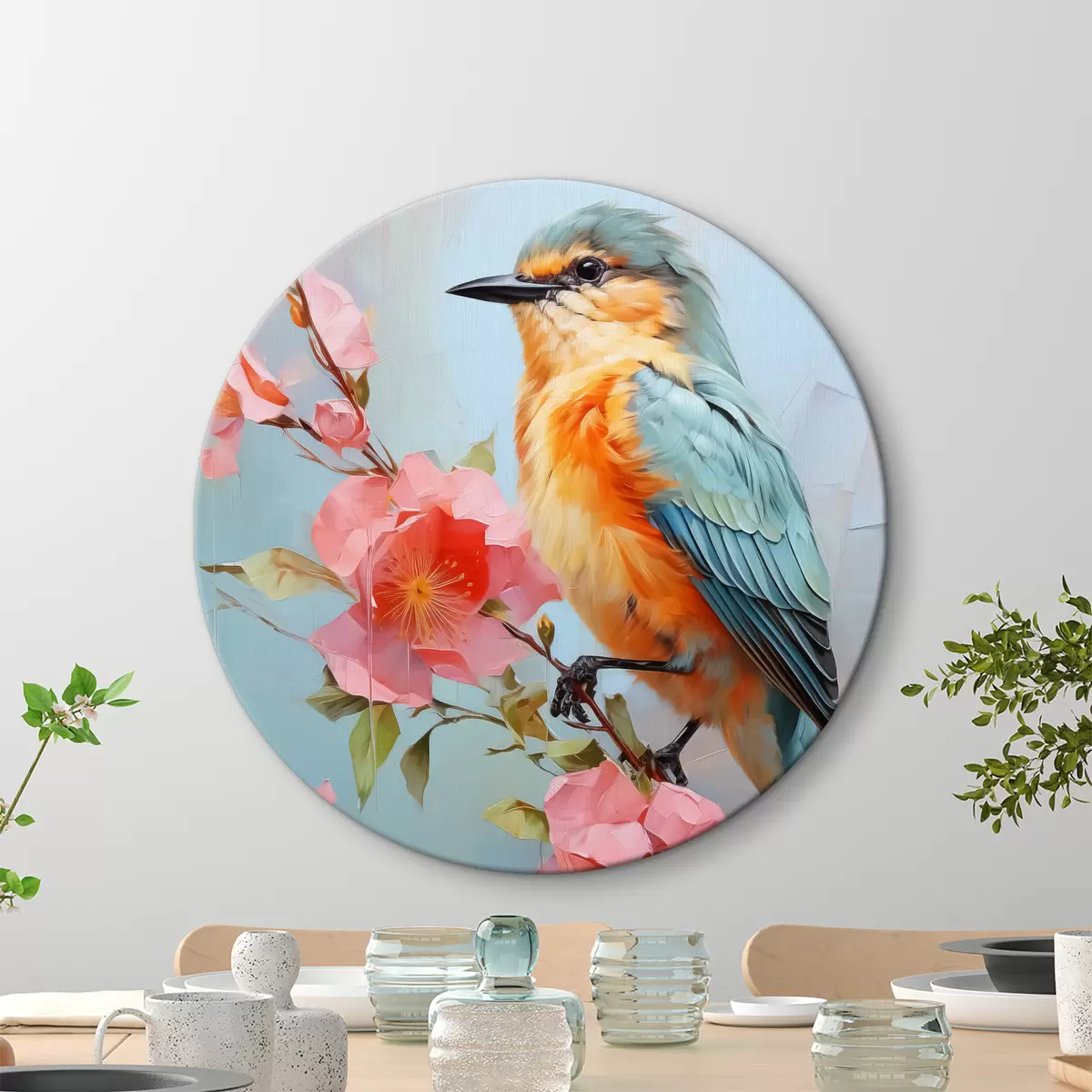 Okrągły obraz Ptak siedzący na gałęzi z kwitnącymi kwiatami w kolorze niebieskim, różowym, czerwonym, pomarańczowym i żółtym Nr r40489