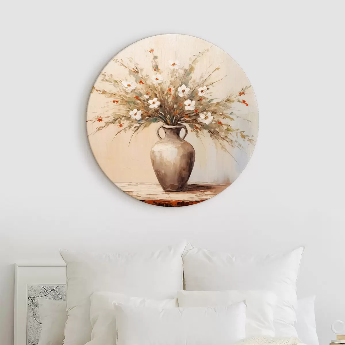 Okrągłe obrazy Delikatny bukiet białych kwiatów i gałązek w antycznym wazonie r40497