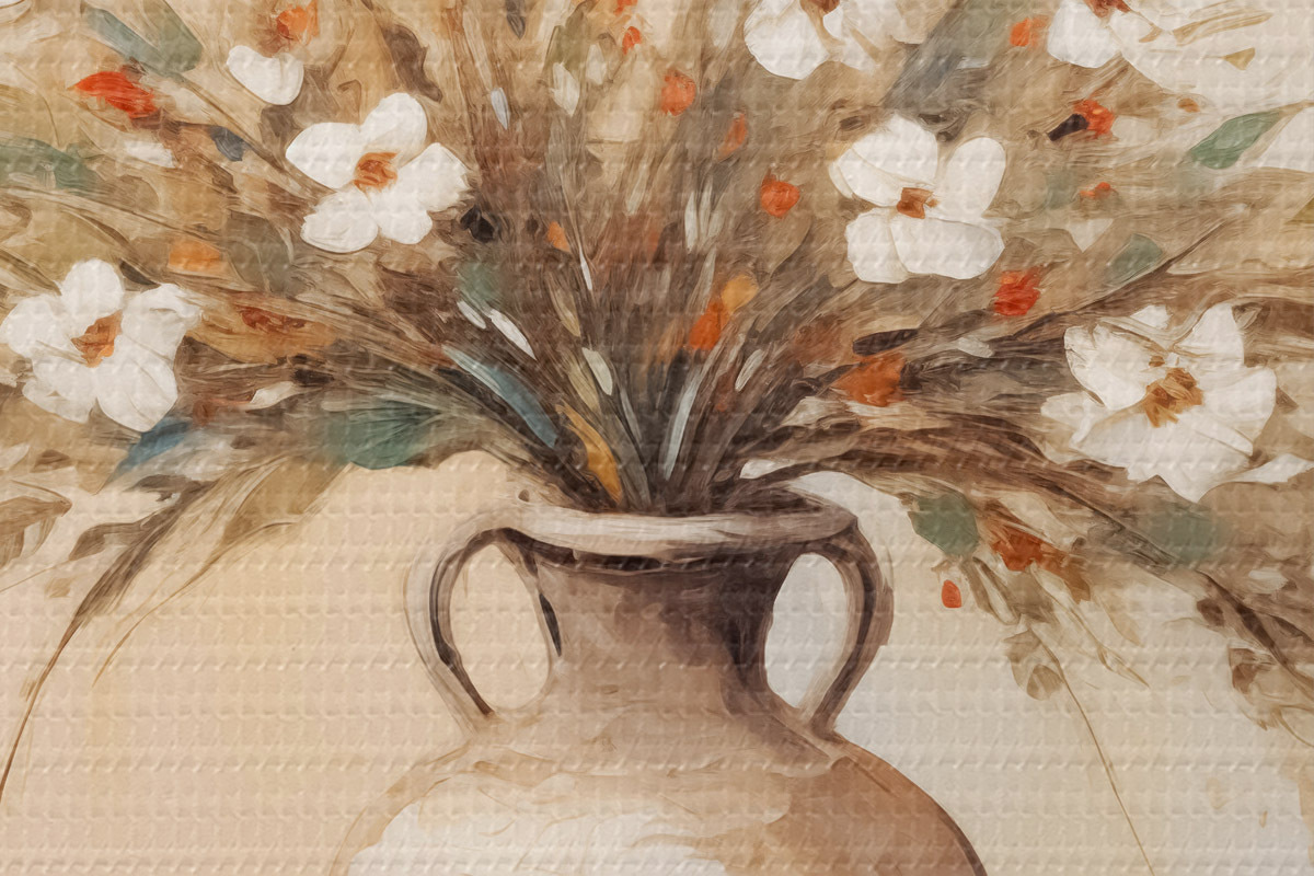 Okrągły obraz Delikatny bukiet białych kwiatów i gałązek w antycznym wazonie Nr r40497