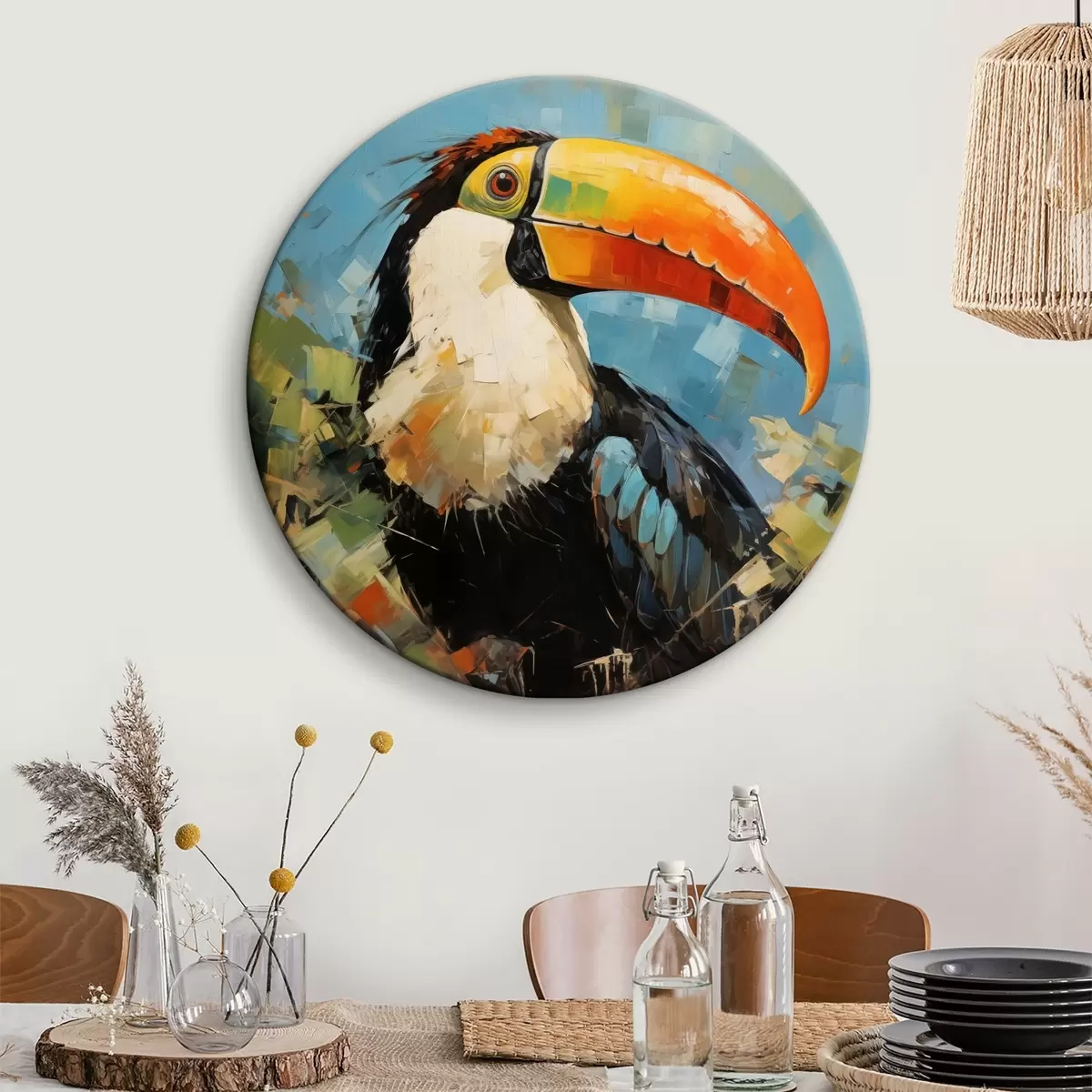 Okrągłe obrazy Ptak tukan na niebiesko-zielonym tle, imitacja pociągnięć pędzla r40498