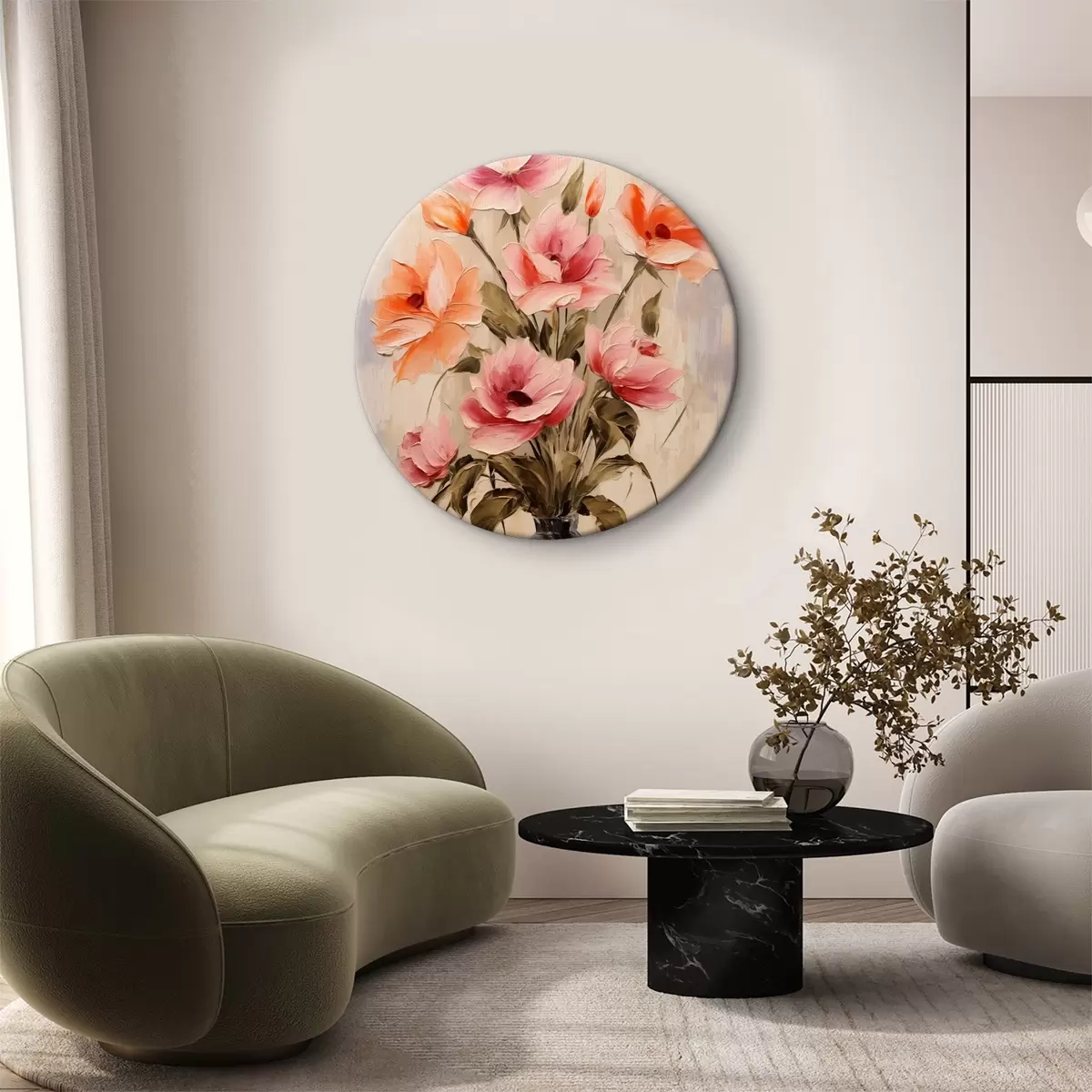 Okrągłe obrazy Bukiet maków w wazonie, czerwony, różowy, pomarańczowy, szary i beżowy r40499