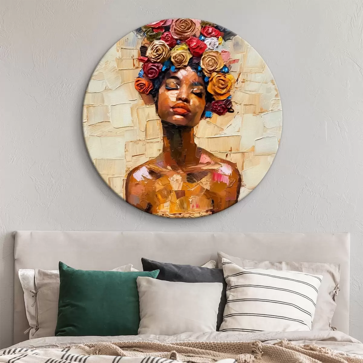 Okrągły obraz Piękna afrykańska modelka z kwiatami Nr r40508