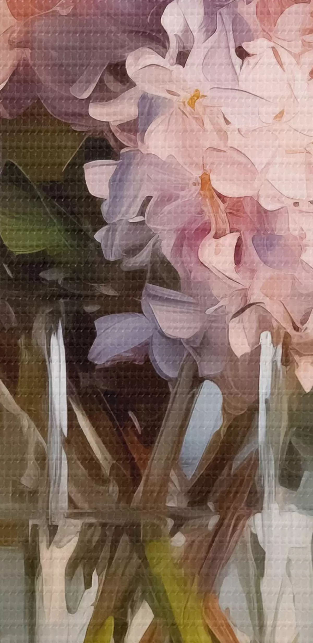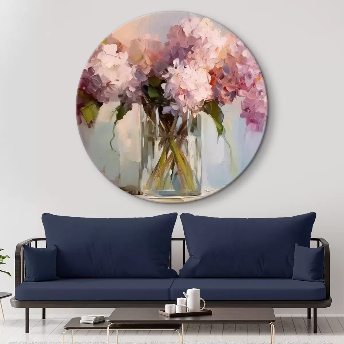 Okrągły obraz Bukiet hiacyntów w dużym szklanym wazonie, pastelowe kolory Nr r40529