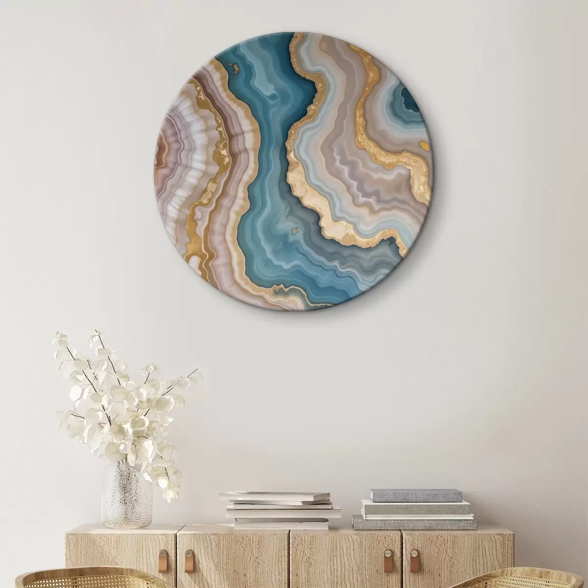 Okrągły obraz Kolorowy abstrakcyjny kamień agatowy z wirującymi wzorami i warstwami turkusu, beżu, różu i żółci Nr r40540