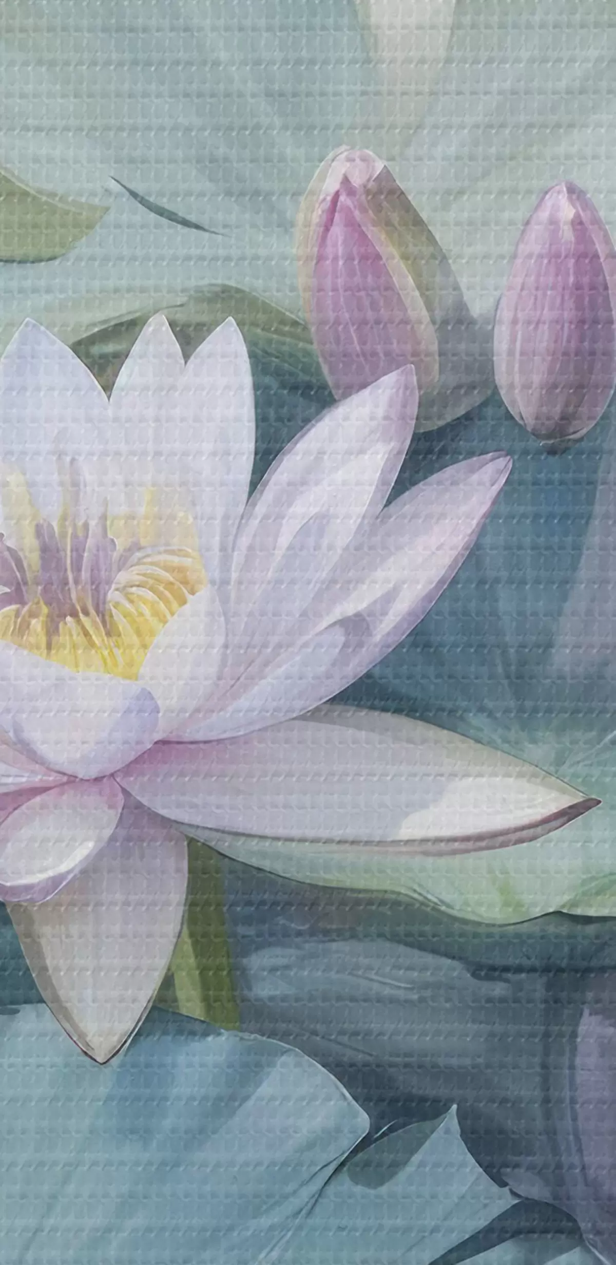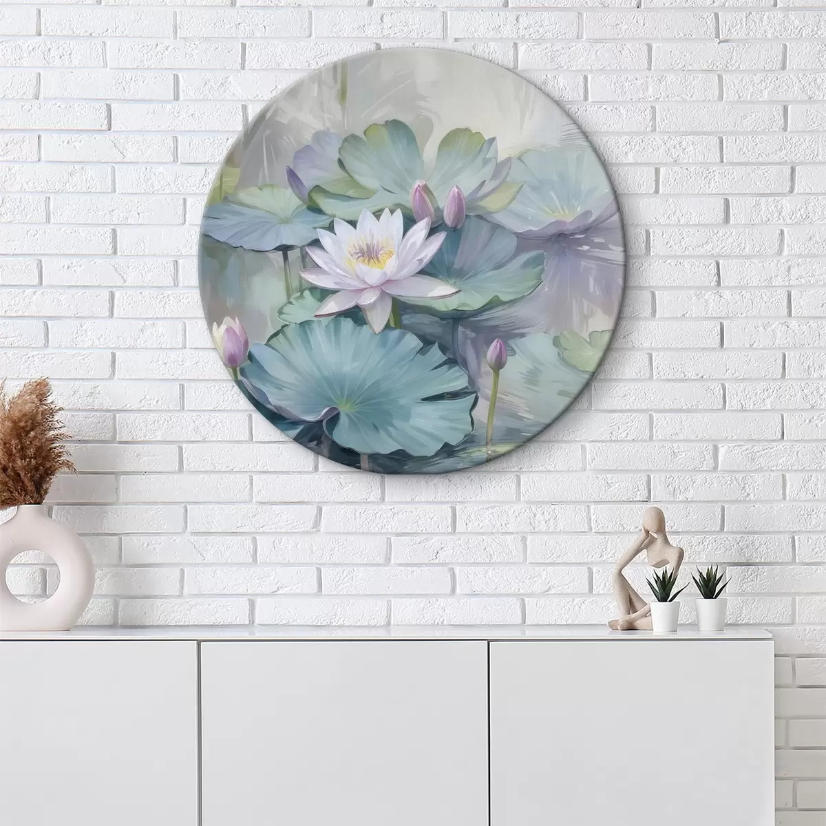 Okrągły obraz Spokojny obraz stawu z liliami wodnymi i kwiatami w pastelowych kolorach, otoczony bujnymi zielonymi liśćmi lilii wodnych Nr r40542