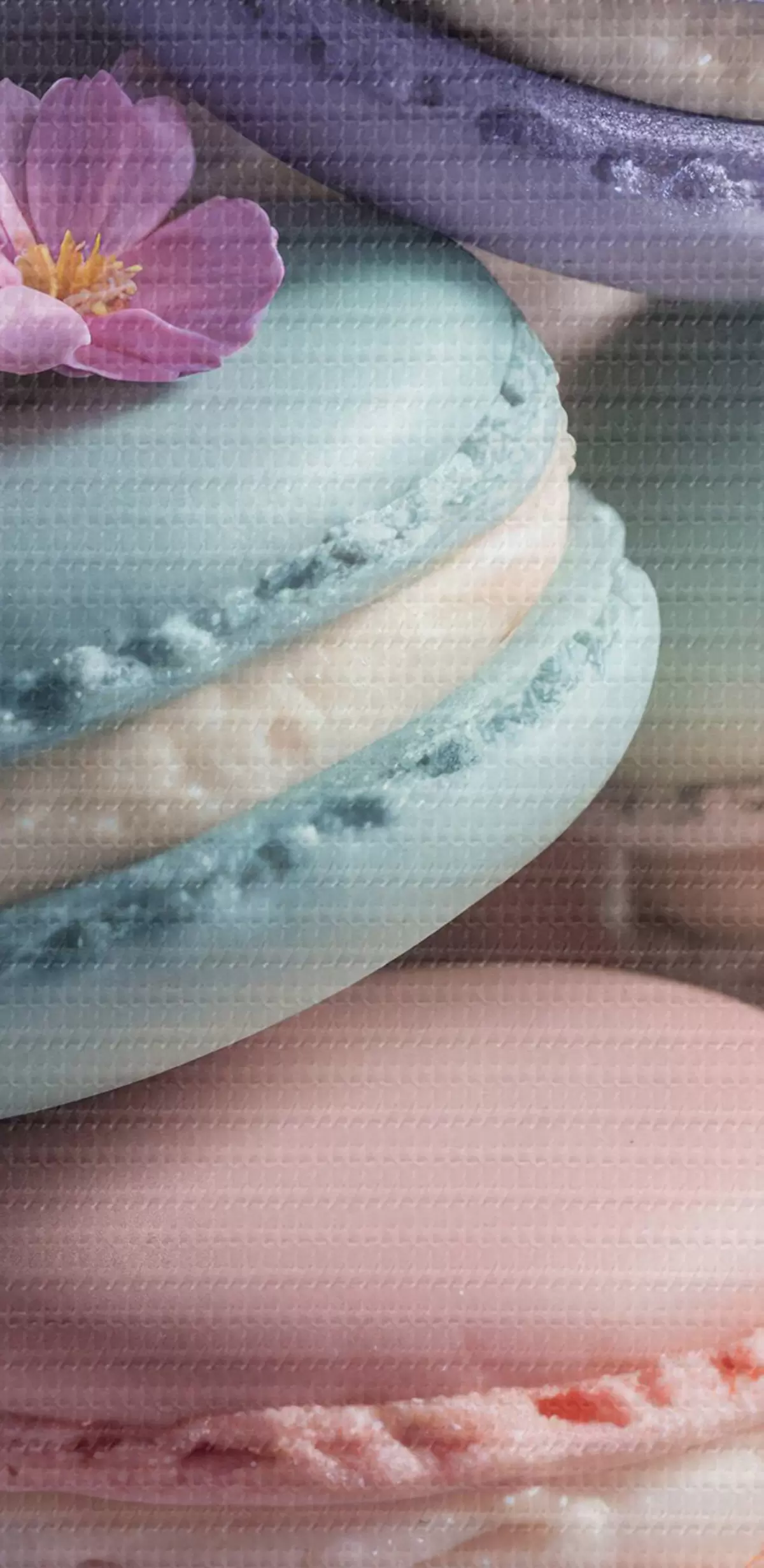 Okrągły obraz Kolorowe makaroniki z różowymi i fioletowymi kwiatami na talerzu, zbliżenie Nr r40546
