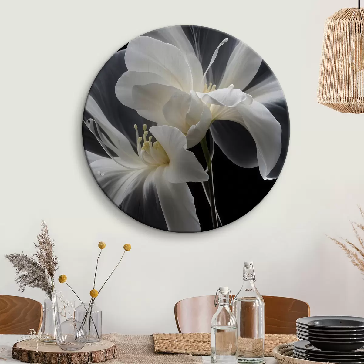 Okrągły obraz Zbliżenie na dwa białe kwiaty z delikatnymi płatkami i żółtymi środkami na ciemnym tle Nr r40549