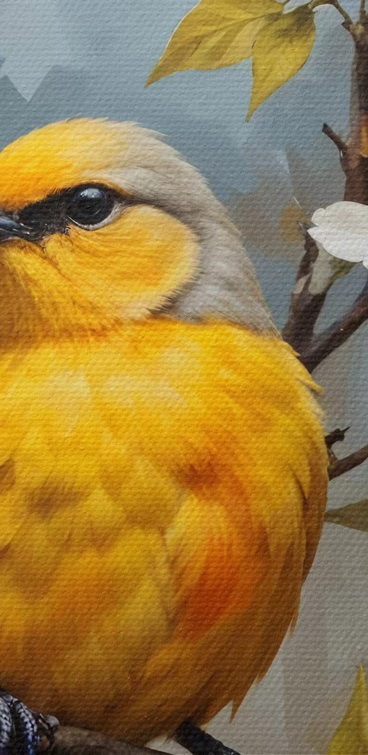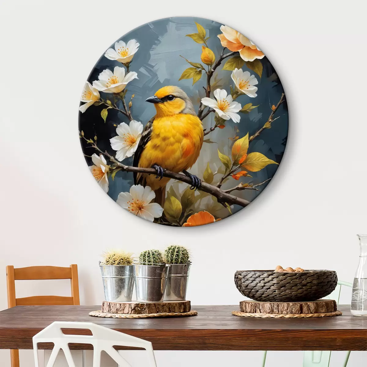 Okrągły obraz Żółty ptak siedzący na gałęzi z białymi i pomarańczowymi kwiatami w tle Nr r40550