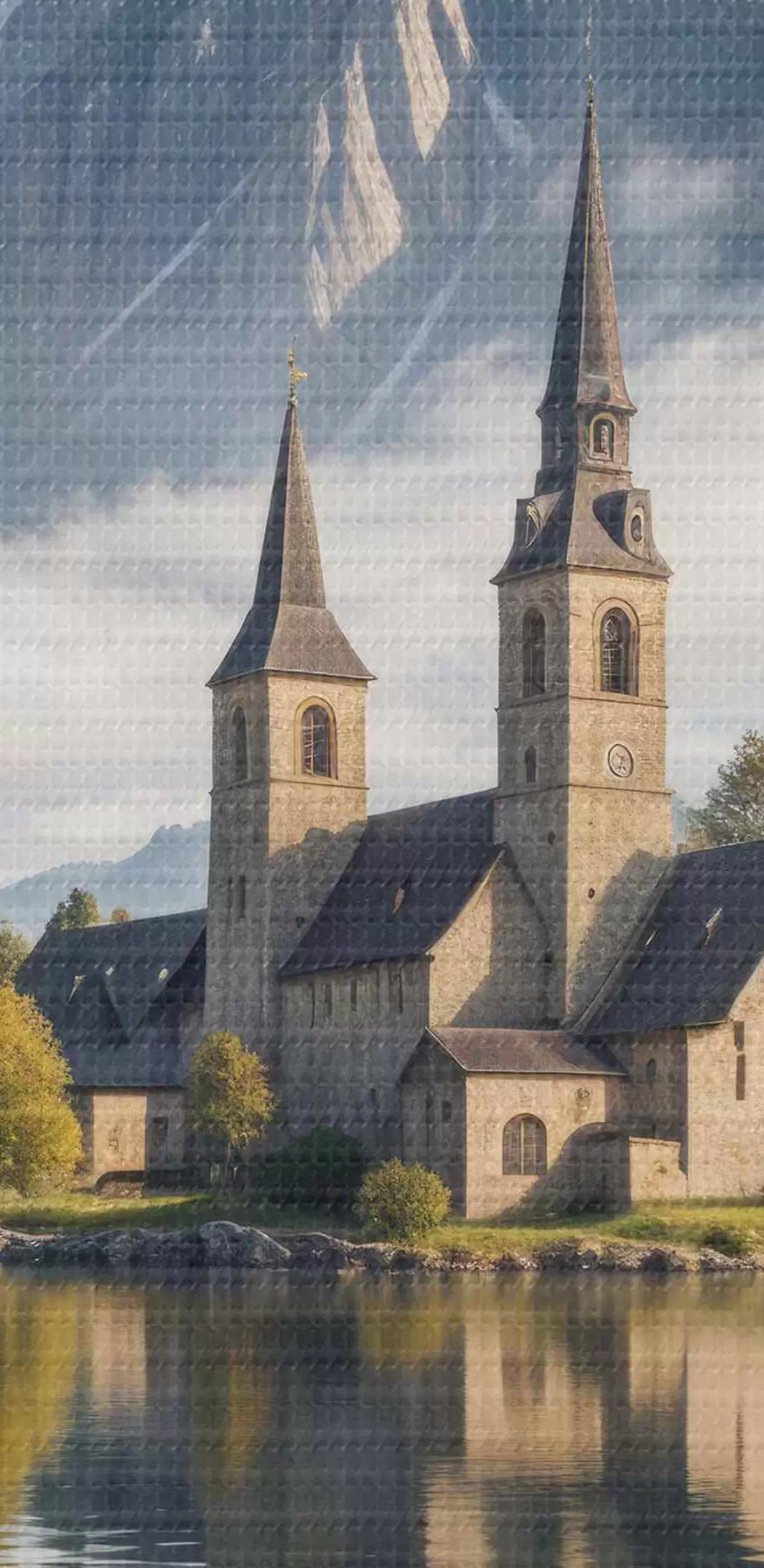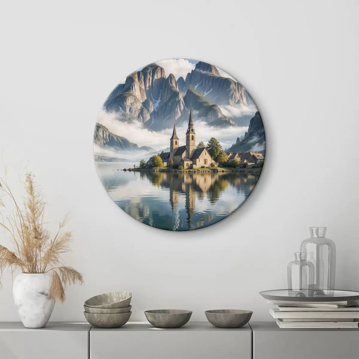 Okrągły obraz Malownicza alpejska wioska położona nad spokojnym jeziorem z górującymi nad nią ośnieżonymi górami Nr r40554