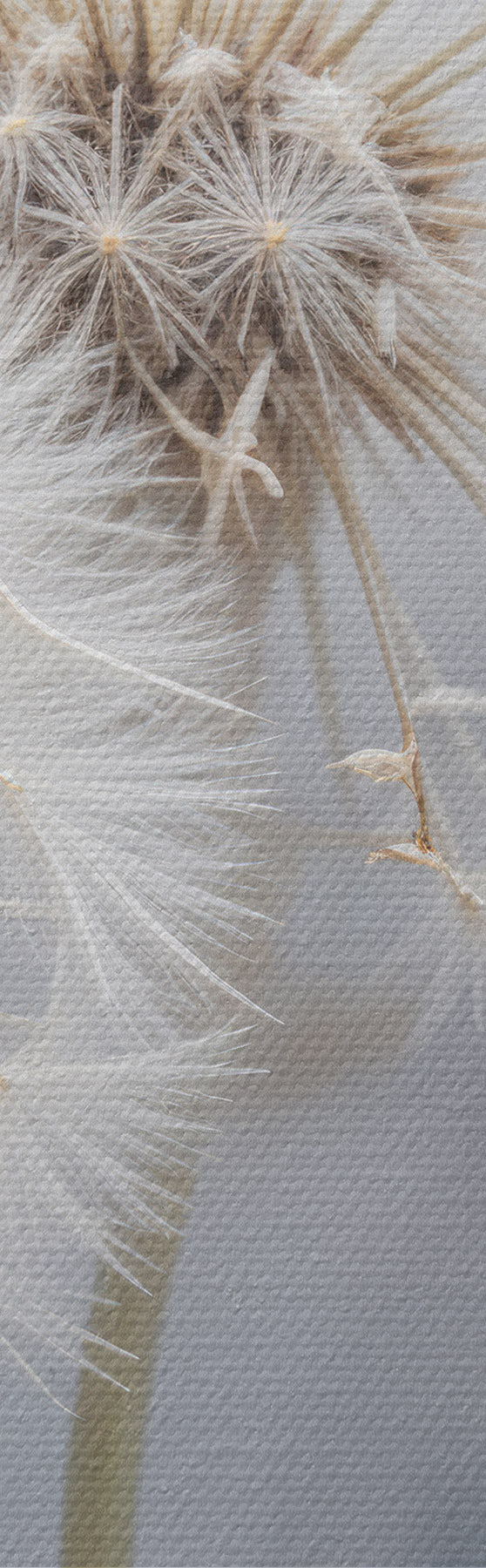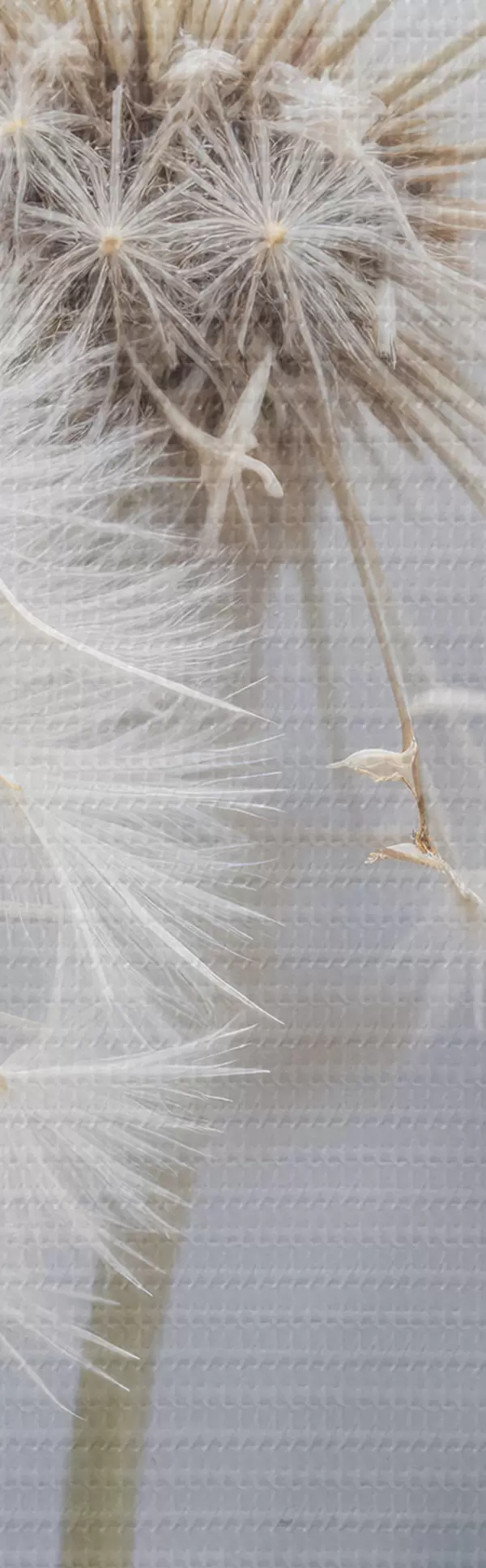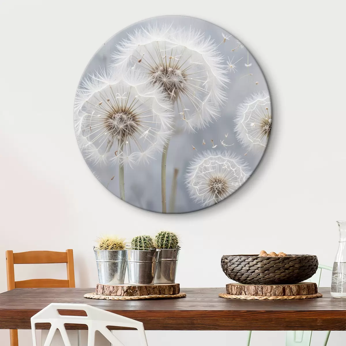 Okrągły obraz Białe kwiaty mniszka lekarskiego z puszystymi nasionami na rozmytym szarym tle Nr r40556