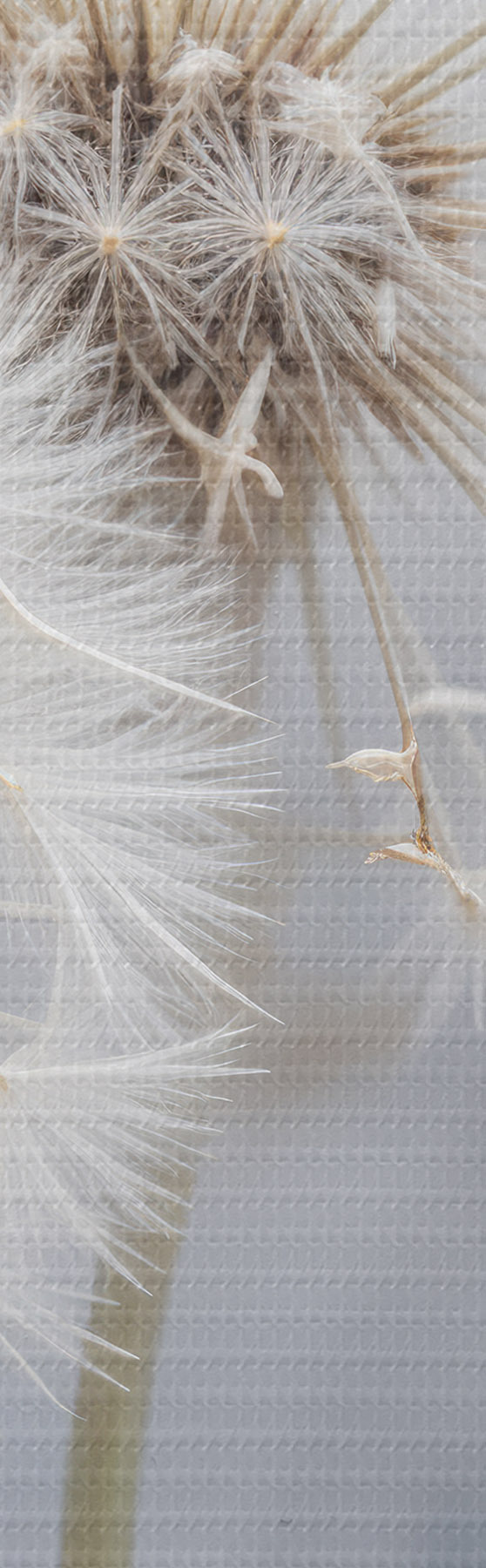 Okrągłe obrazy Białe kwiaty mniszka lekarskiego z puszystymi nasionami na rozmytym szarym tle r40556