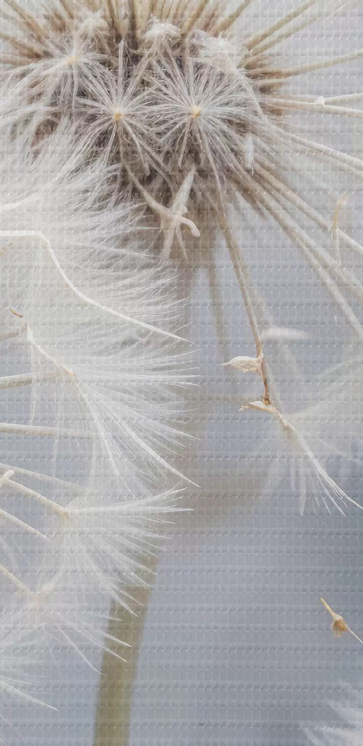 Okrągły obraz Białe kwiaty mniszka lekarskiego z puszystymi nasionami na rozmytym szarym tle Nr r40556
