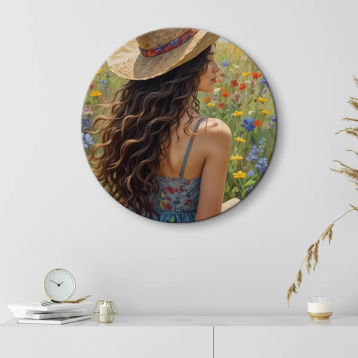 Okrągły obraz Młoda kobieta z kręconymi włosami, w słomkowym kapeluszu i kwiecistej sukience, stojąca na polu polnych kwiatów Nr r40560