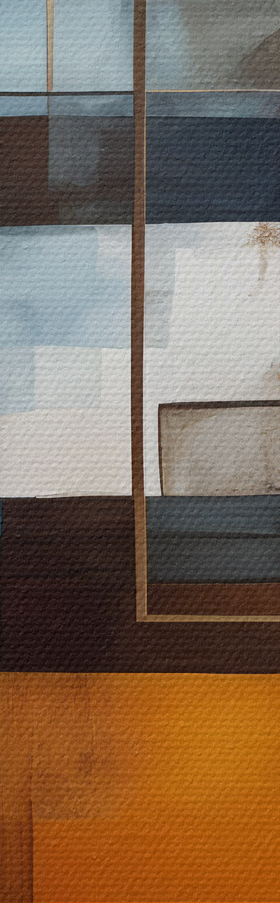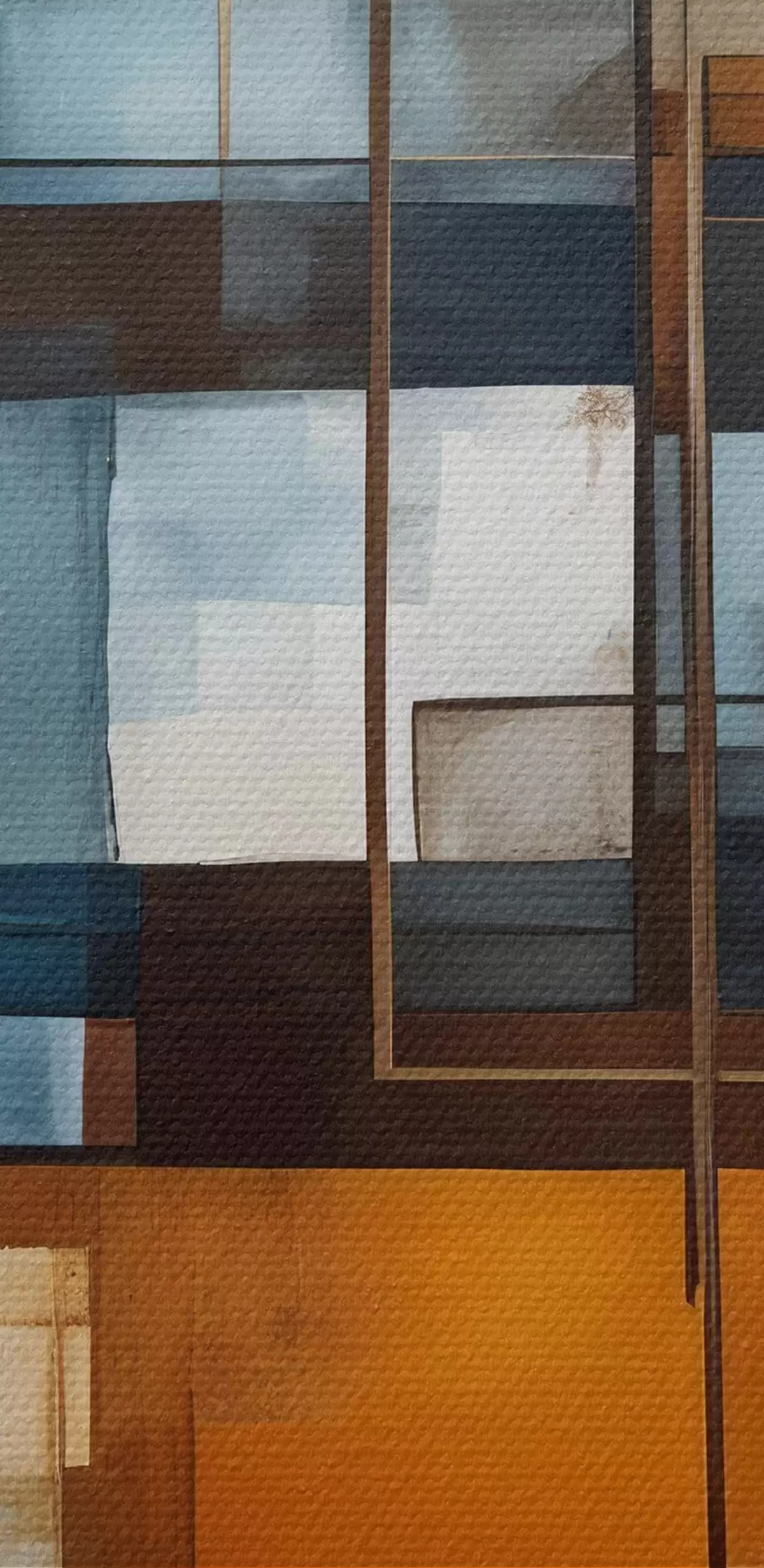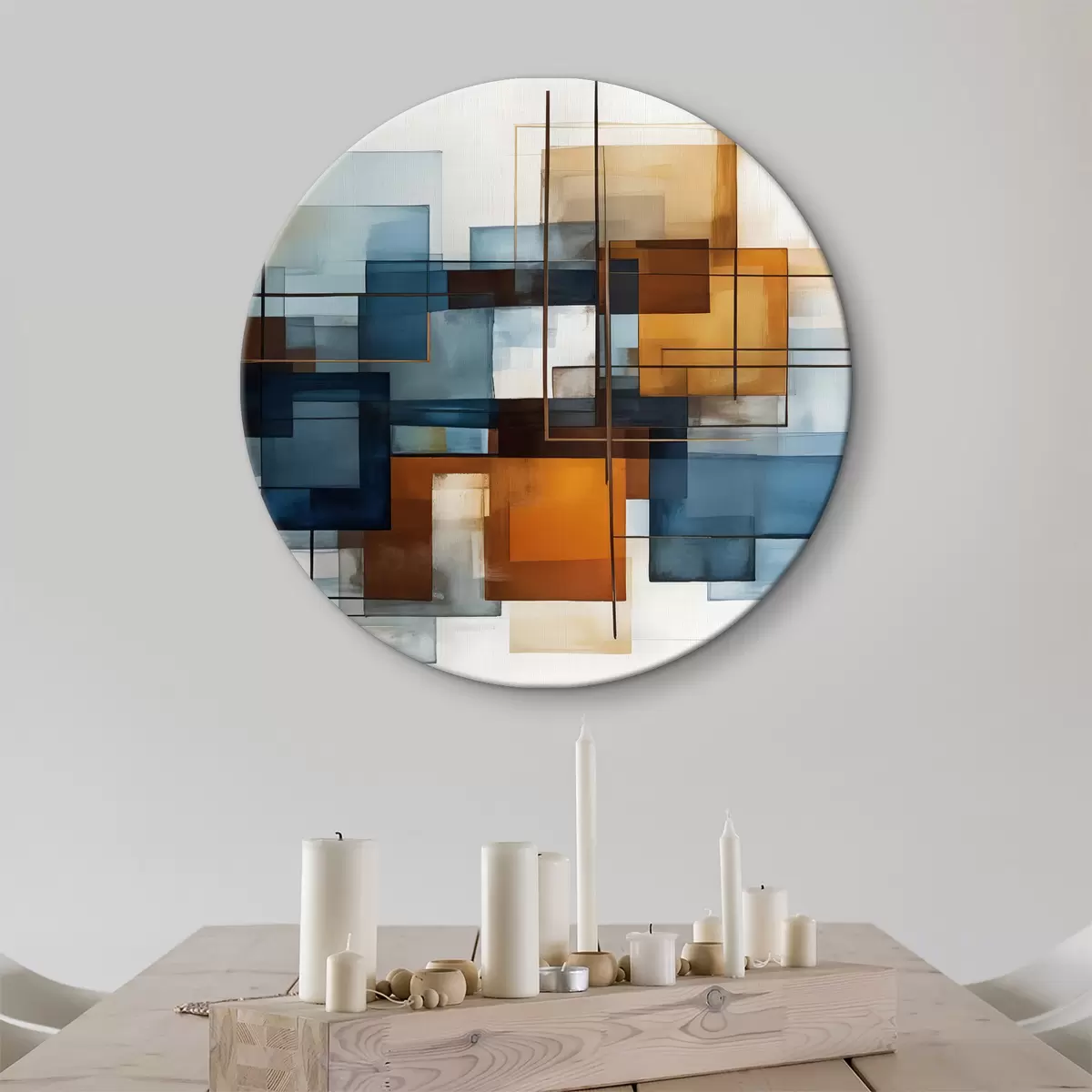 Okrągły obraz Abstrakcyjne geometryczne kształty w odcieniach niebieskiego, pomarańczowego i brązowego tworzą nowoczesną, minimalistyczną kompozycję. Nr r40563