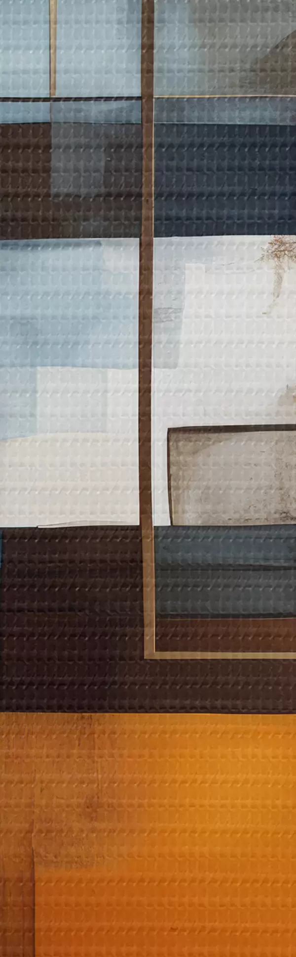 Okrągłe obrazy Abstrakcyjne geometryczne kształty w odcieniach niebieskiego, pomarańczowego i brązowego tworzą nowoczesną, minimalistyczną kompozycję. r40563