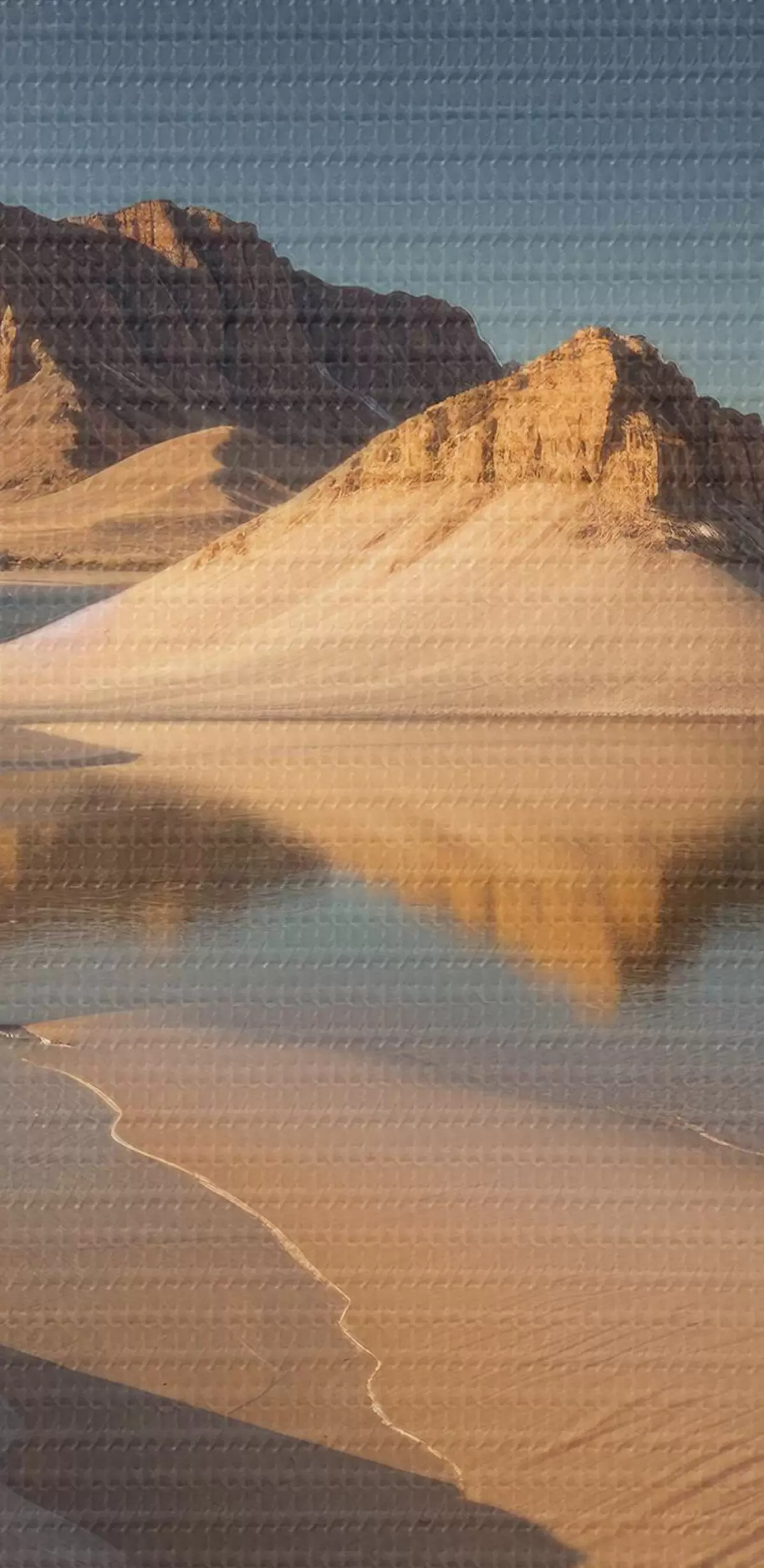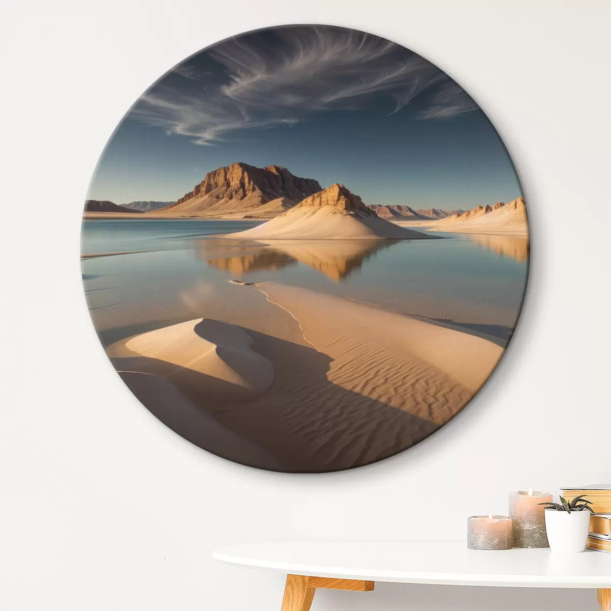 Okrągły obraz Rozległy pustynny krajobraz z wysokimi formacjami skalnymi odbijającymi się w płytkiej wodzie Nr r40568