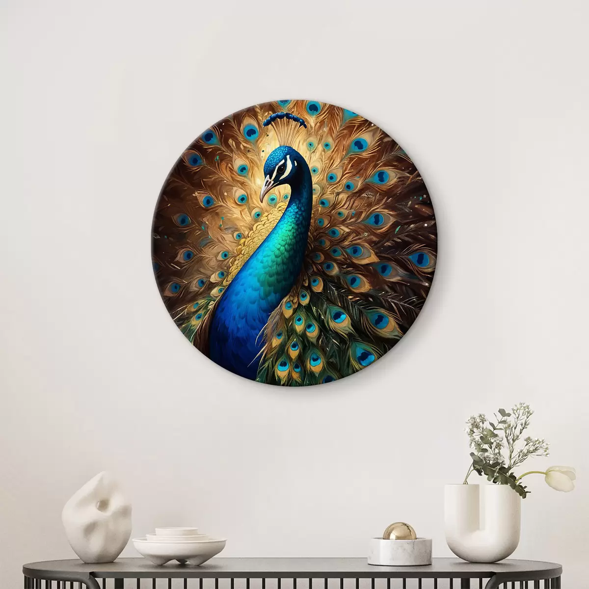 Okrągły obraz Żywy paw z w pełni odsłoniętymi piórami, prezentujący oszałamiające niebiesko-zielone upierzenie Nr r40571