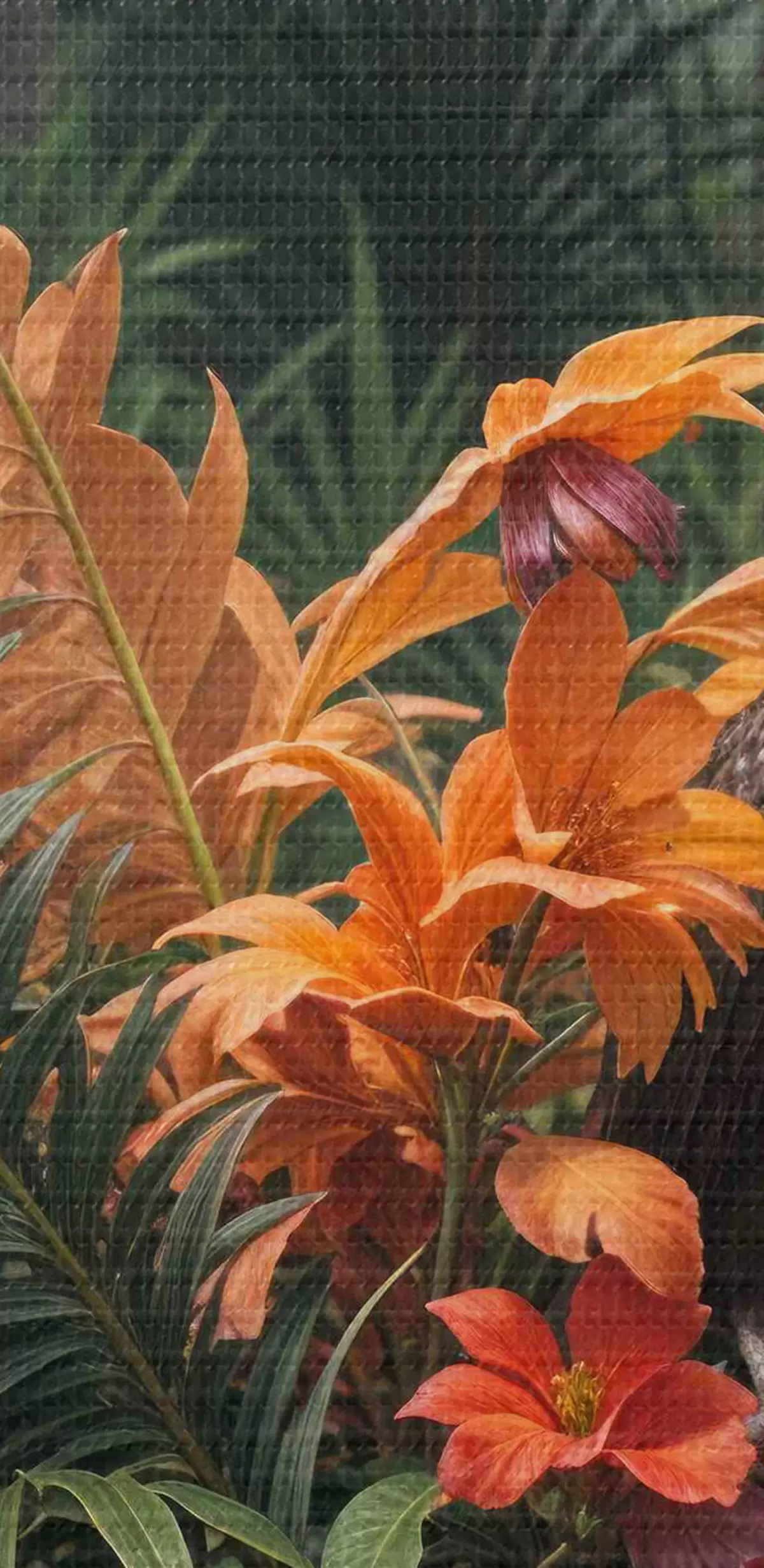 Okrągły obraz Tropikalny ptak siedzący na gałęzi otoczony bujną roślinnością, liśćmi palmowymi, kwiatami i egzotycznymi roślinami Nr r40578