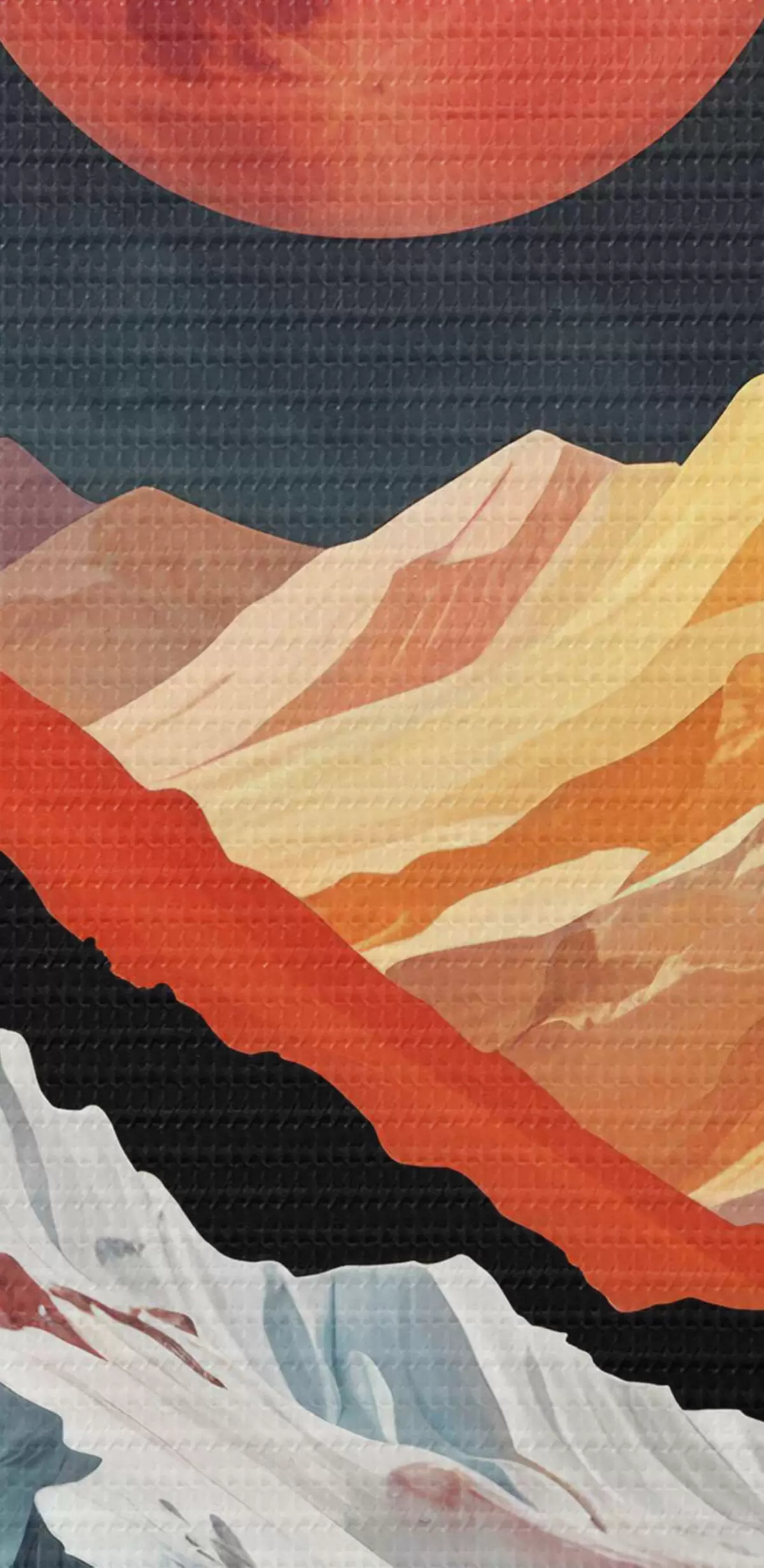 Okrągły obraz Surrealistyczny krajobraz z wysokimi poszarpanymi górami pod dużym świecącym czerwonym księżycem na ciemnym zachmurzonym niebie Nr r40589