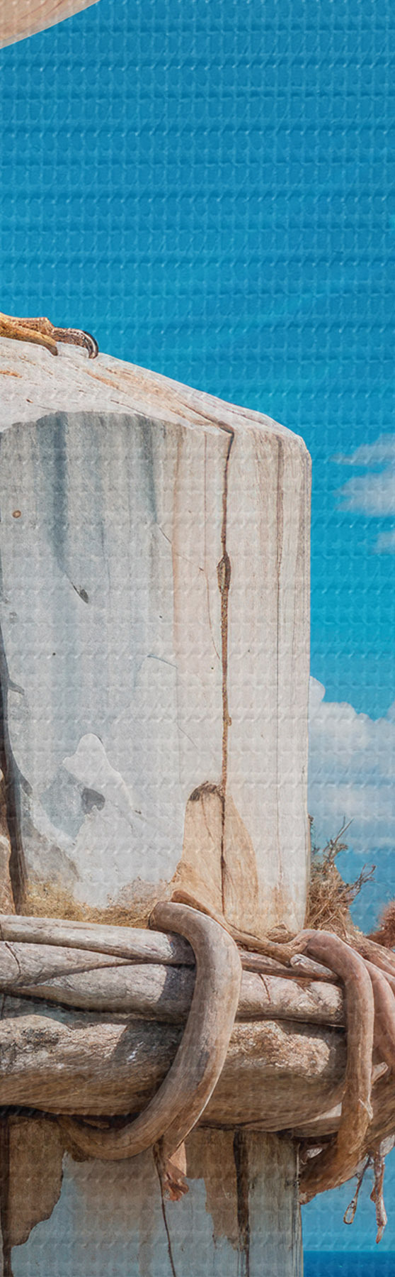 Okrągły obraz Biała mewa siedząca na drewnianym palu na tle jasnoniebieskiego nieba i oceanu z falami Nr r40590