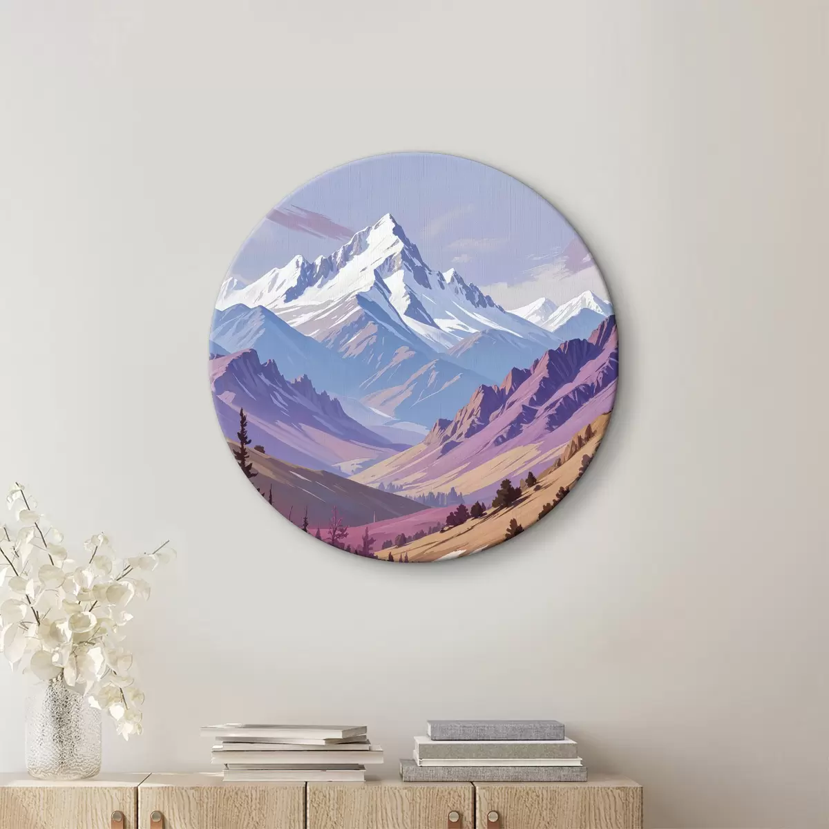 Okrągły obraz Ośnieżone szczyty górskie w kolorowym krajobrazie z sosnami na pierwszym planie Nr r40595