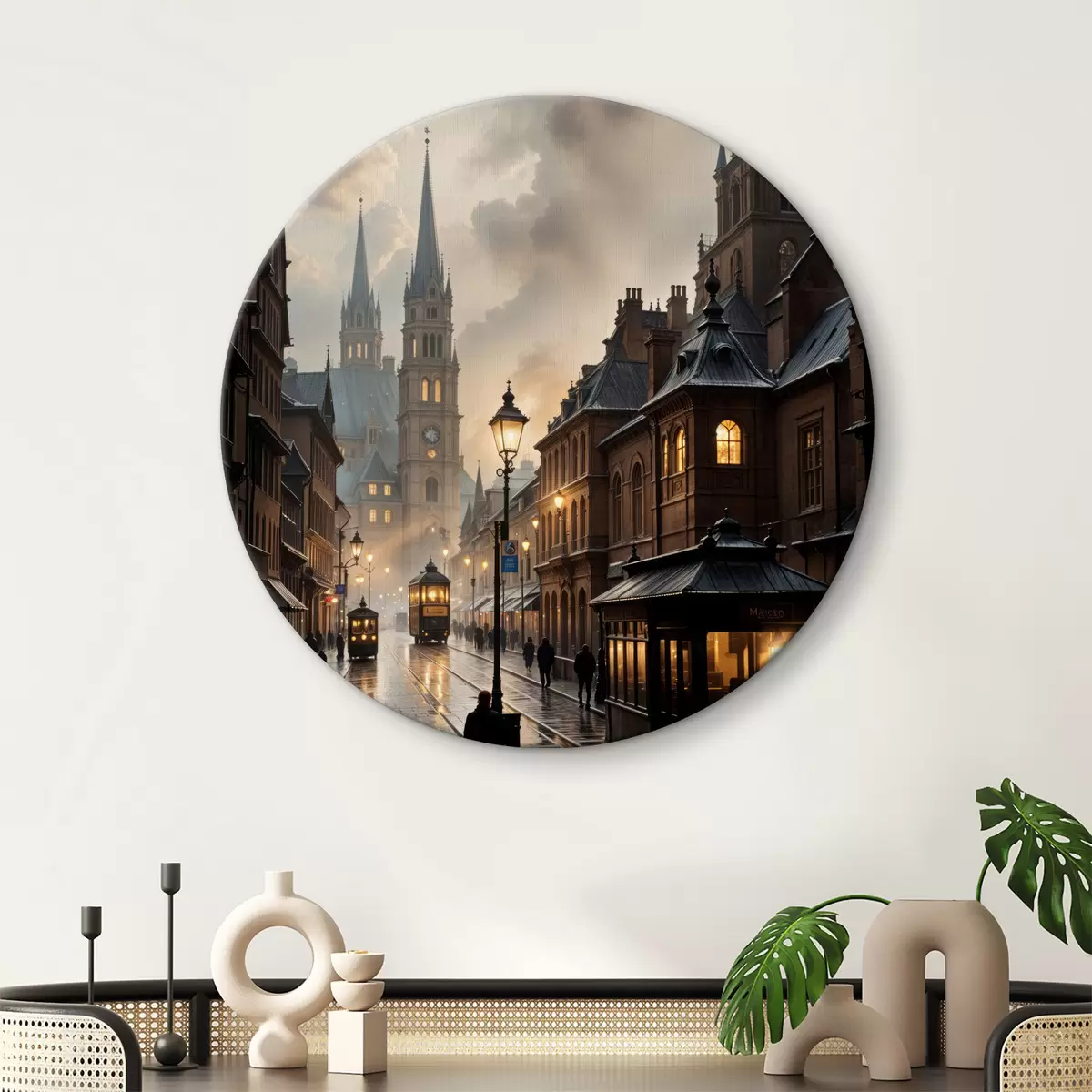 Okrągły obraz Deszczowy wieczór w starym europejskim mieście, z brukowanymi uliczkami, zabytkowymi budynkami i przejeżdżającym tramwajem Nr r40604