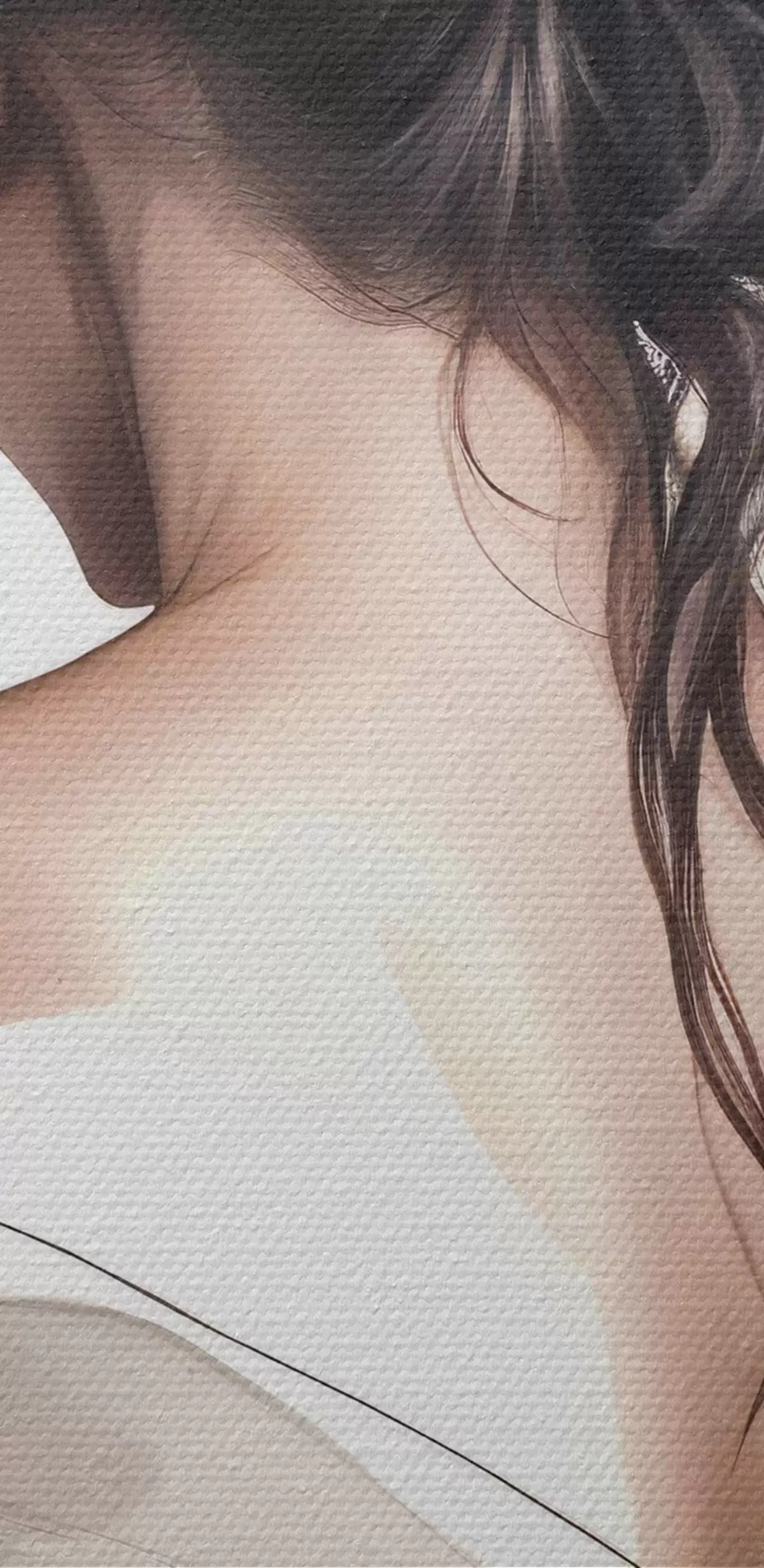 Okrągły obraz Minimalistyczny obraz przedstawiający kobietę z długimi, ciemnymi falowanymi włosami ułożonymi w eleganckie upięcie, ubraną w biały szlafrok Nr r40605