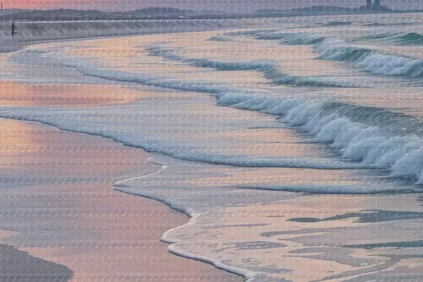 Okrągły obraz Spokojna scena na plaży o zachodzie słońca, z delikatnymi falami docierającymi do piaszczystego brzegu Nr r40606