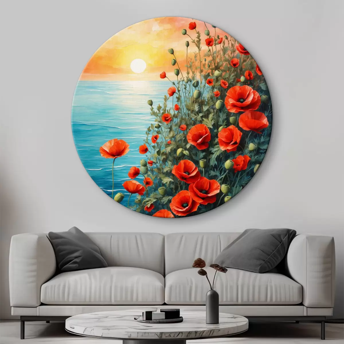 Okrągły obraz Kwitnące maki na tle morza Nr r40637