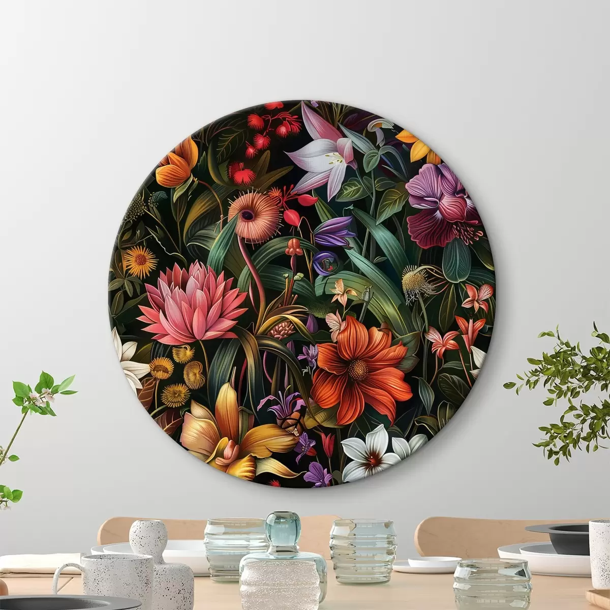 Okrągły obraz Tropikalna kompozycja z różnorodną zielenią i tropikalnymi kwiatami Nr r40667