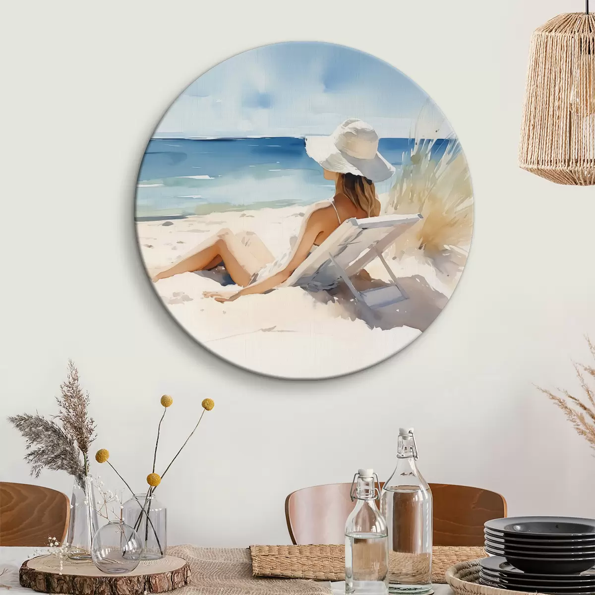 Okrągłe obrazy Dziewczyna relaksująca się na plaży nad morzem akwarela r40679