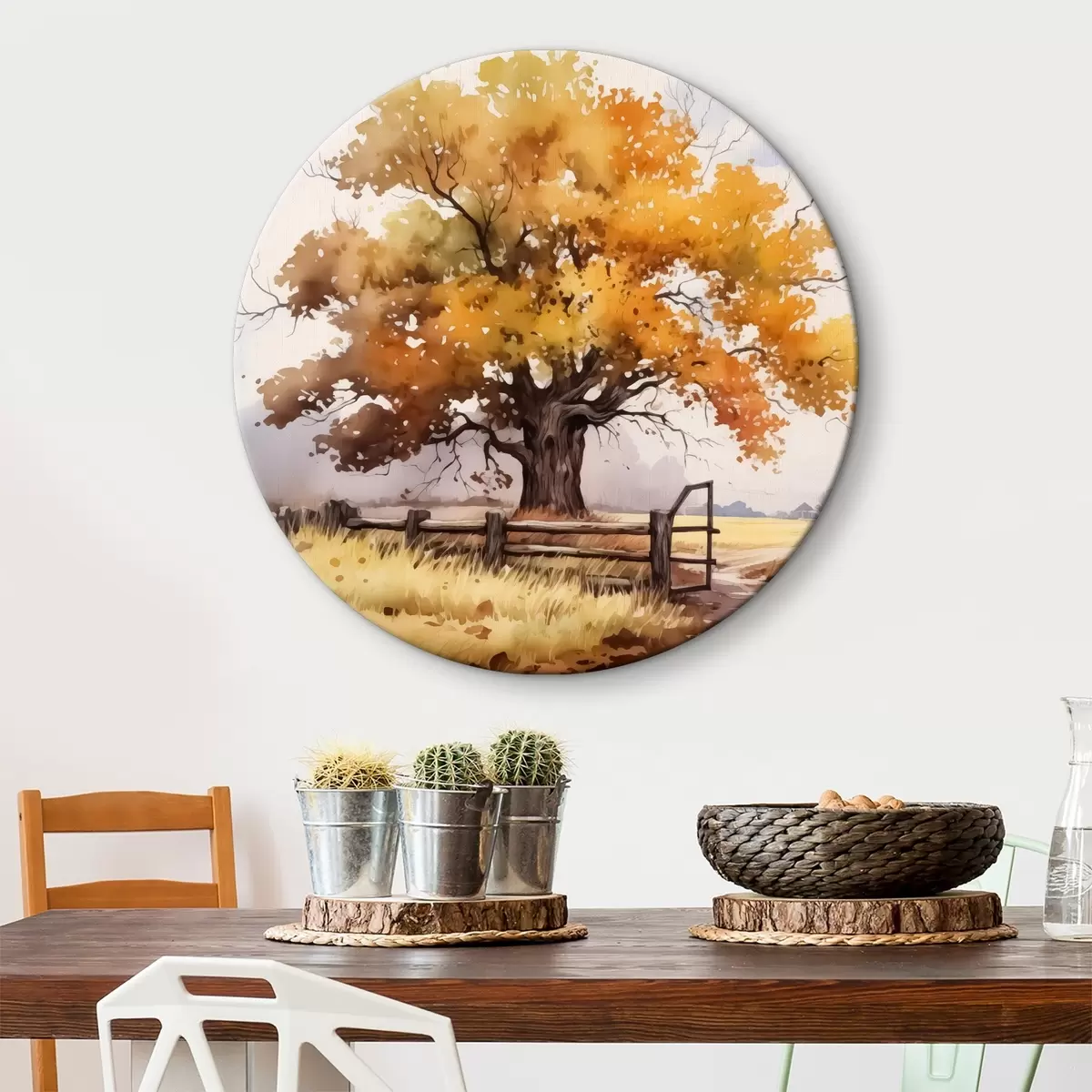 Okrągły obraz Drzewo na polu w pobliżu ogrodzenia z pożółkłymi liśćmi, jesienny krajobraz Nr r40680
