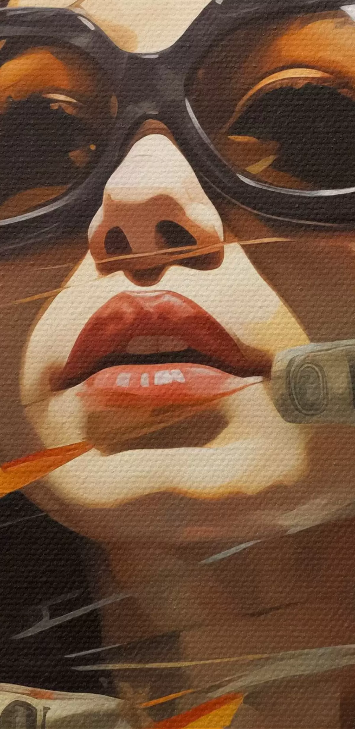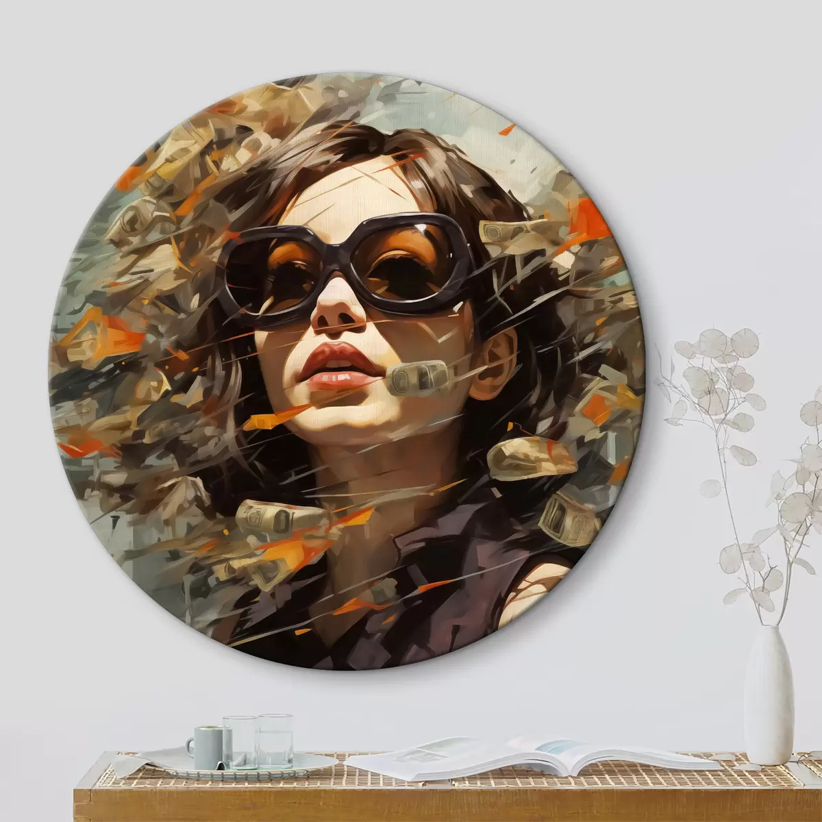 Okrągły obraz Dziewczyna w okularach przeciwsłonecznych otoczona abstrakcyjnymi pieniędzmi Nr r40750