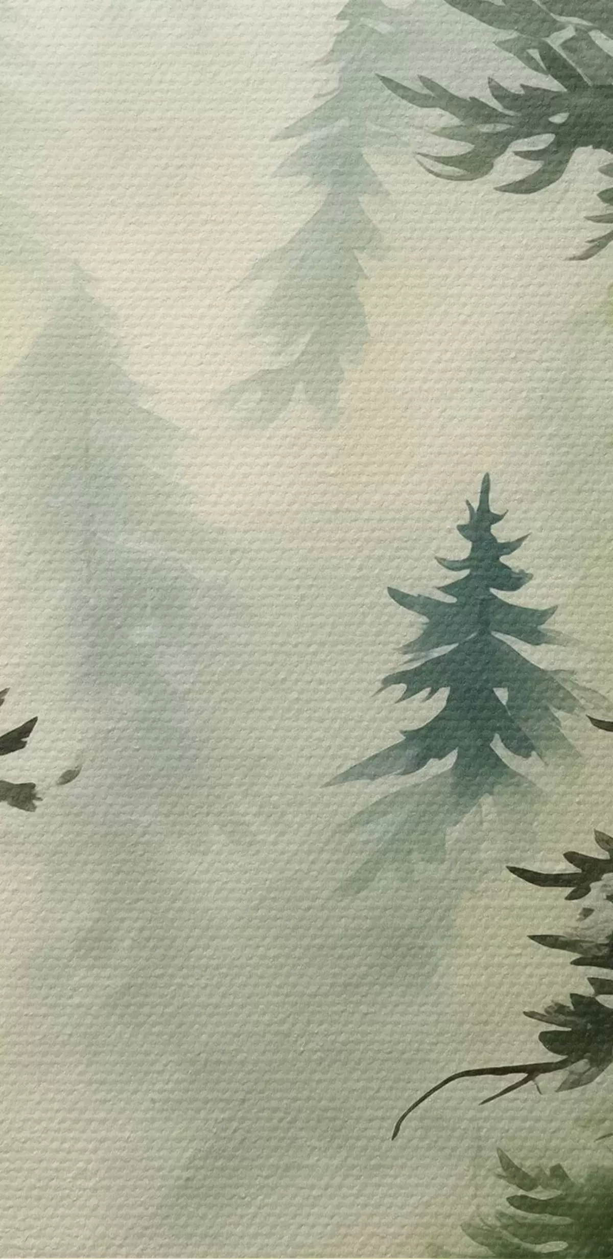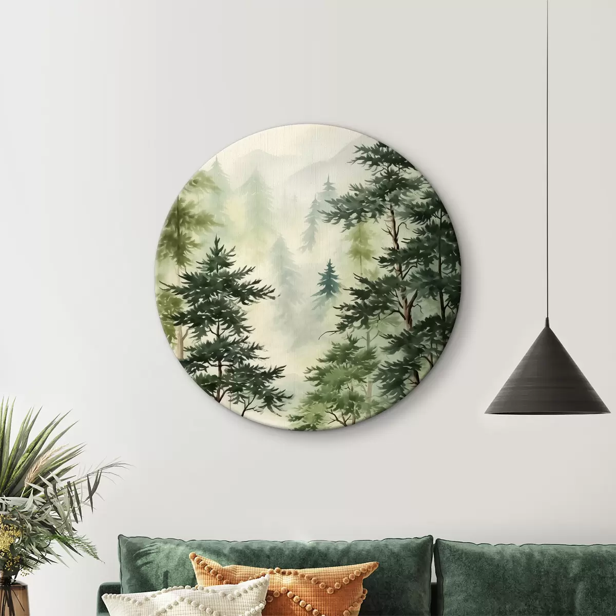Okrągły obraz Jodły w lesie na tle gór, akwarela, zielony Nr r40889
