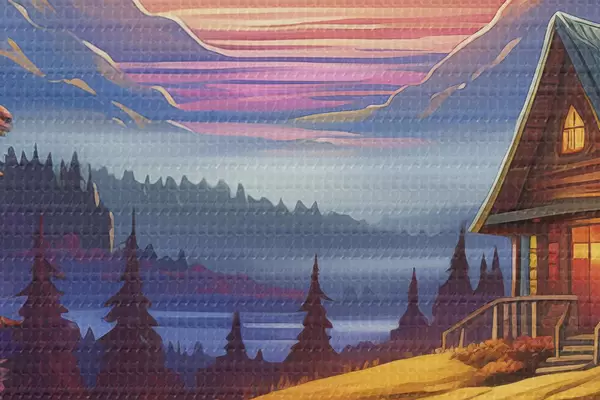 Okrągły obraz Kapryśny krajobraz z górami i drewnianym domem Nr r40940