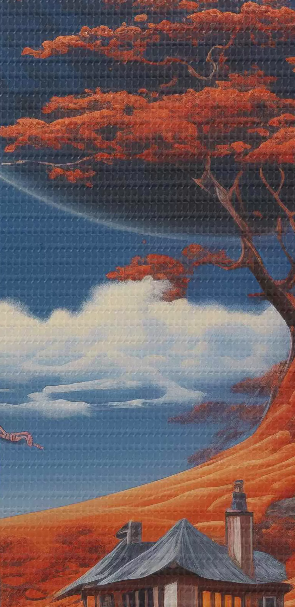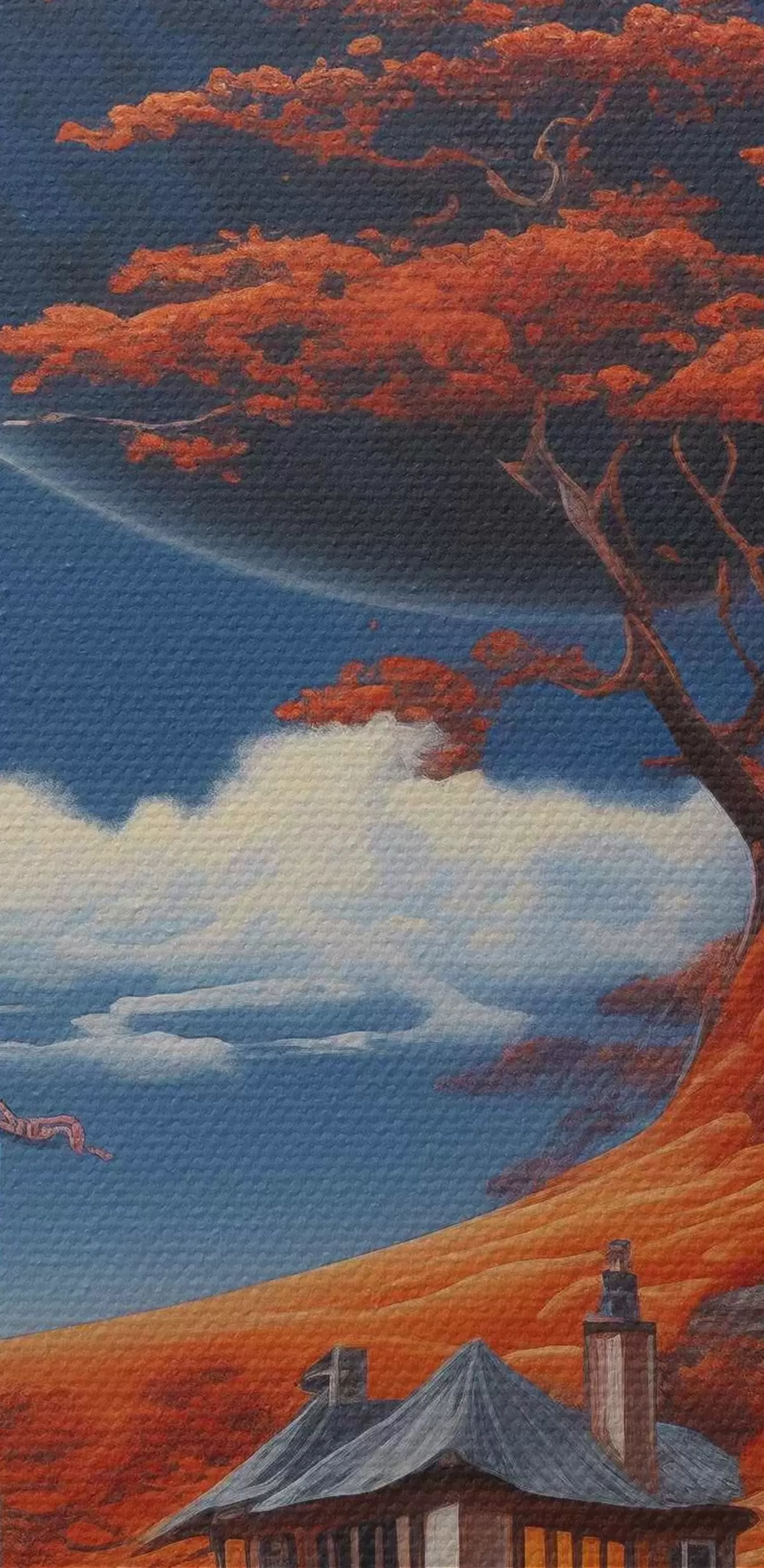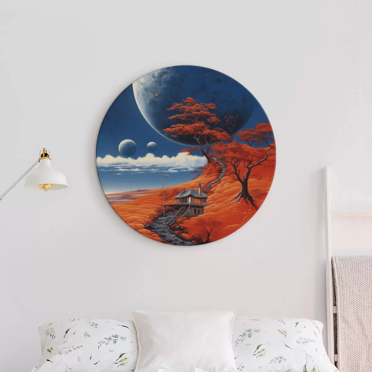 Okrągły obraz Ilustracja kosmosu, planety, błękitne niebo, dom na wzgórzu, drzewa Nr r40946