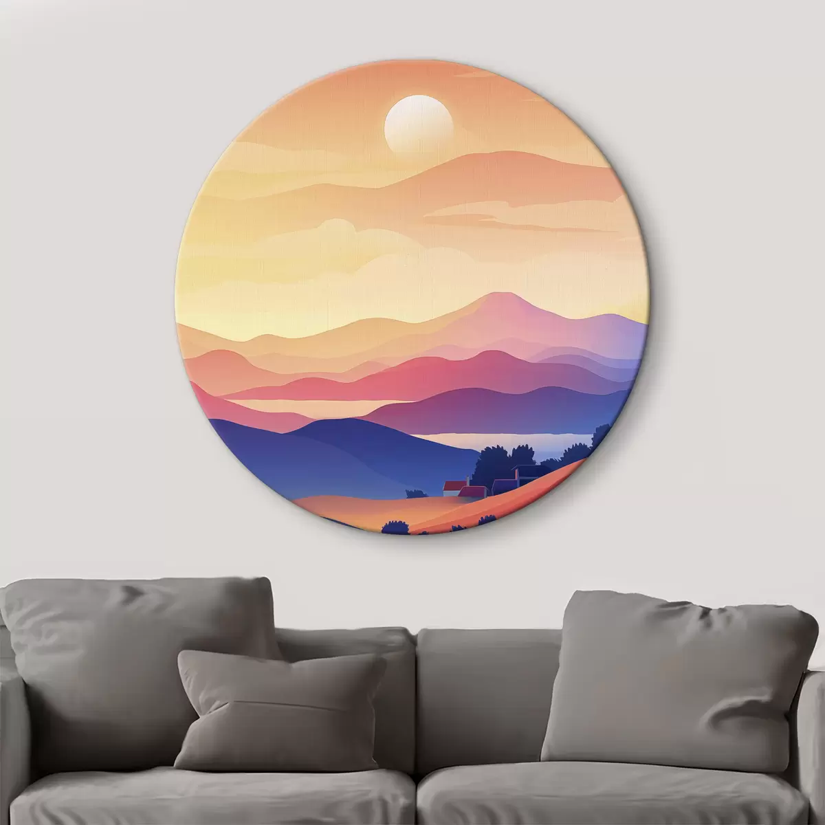 Okrągły obraz Abstrakcja krajobrazy, góry, zachód słońca, domy Nr r40948