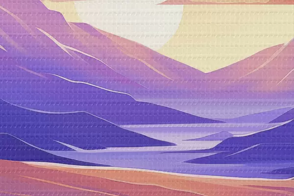 Okrągły obraz Fioletowy zachód słońca w górach, rzeka, drzewa, mały domek Nr r40949