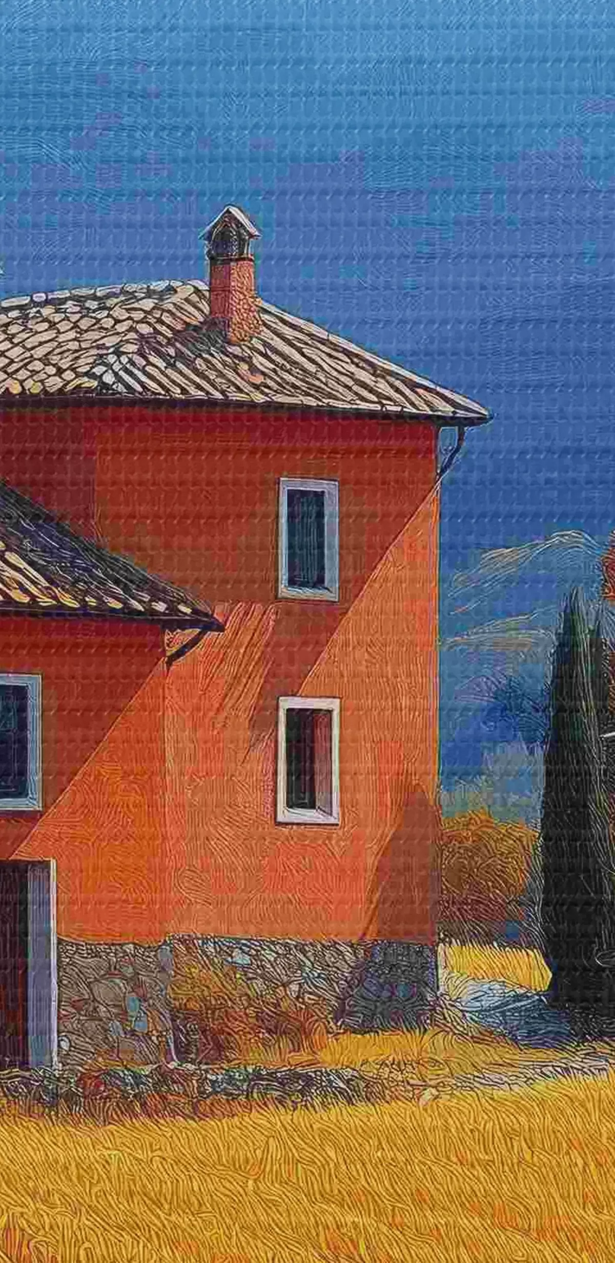 Okrągły obraz Domek na polu z jesiennymi górami w tle Nr r40962